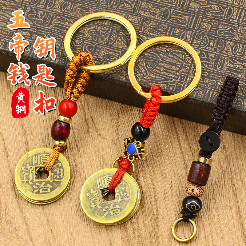 純銅五帝マネーキーホルダーフラットノット祥雲ビーズストラップダイヤモンドノットイエローロープポータブルクリエイティブキーホルダーアクセサリー