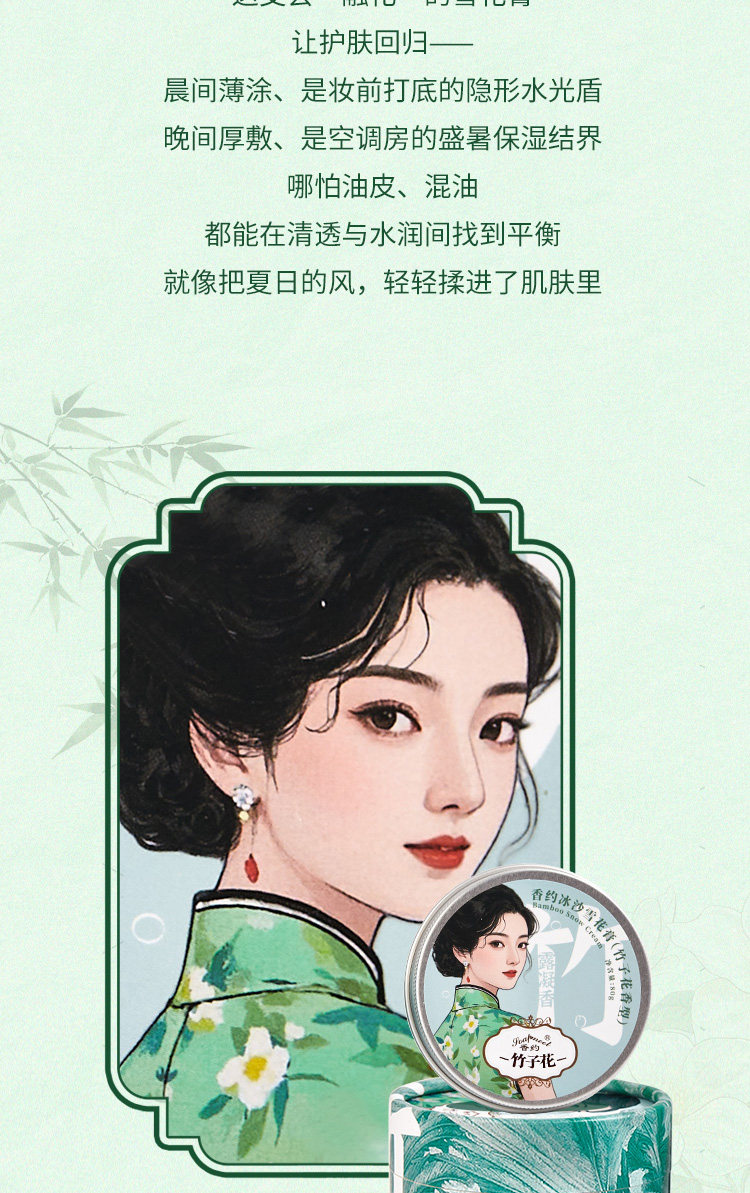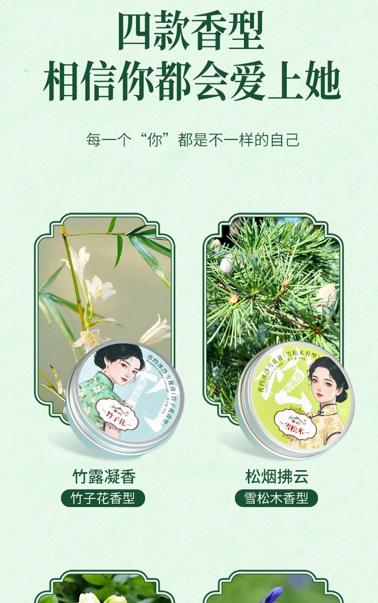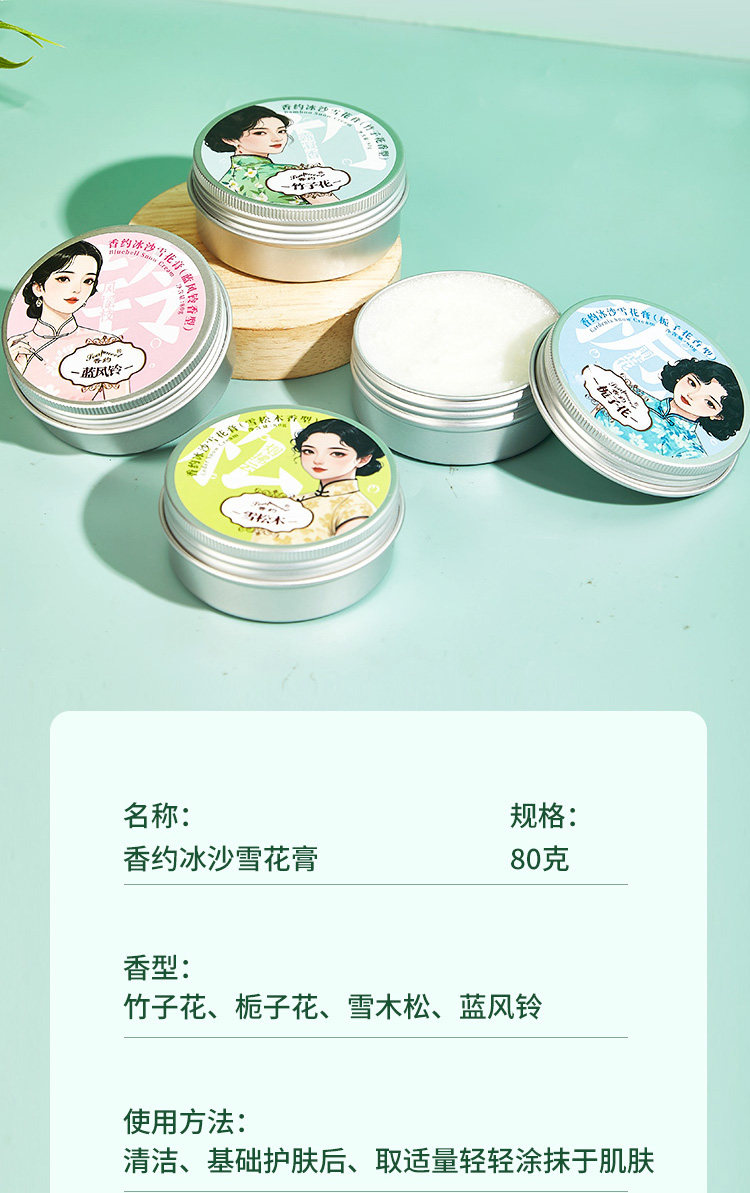 产品规格 香约冰沙雪花膏(栀子花香型)80g,香约冰沙雪花膏(蓝风铃香型)80g,香约冰沙雪花膏(竹子花香型)80g,香约冰沙雪花膏(雪松木香型)80g,香约镜中月珍珠膏(栀子花香型)78g,香约镜中月珍珠膏(樱花香型)78g,香约镜中月珍珠膏(铃兰香型)78g,香约镜中月珍珠膏(白兰花香型)78g