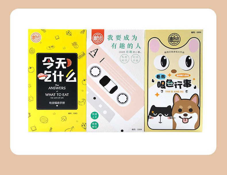 仕様 目の色のゲーム,真実か冒険か,答えカード,今日何を食べるか,このゲームをプレイして壊してください,面白い人になりたい,罰カード