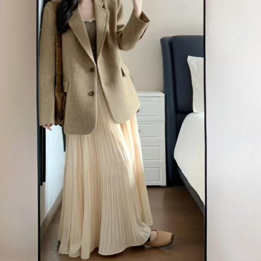 大きいサイズのぽっちゃりさん向け、ケーキのような白いスカート、秋のゆったりとした傘型スカート、プリーツ入りタイトなミディ丈スカート、メーカー直販