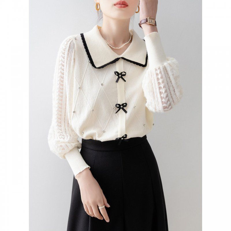 洋气穿搭高级感上衣针织衫女2025新款春秋拼色娃娃领镂空拼接毛衣