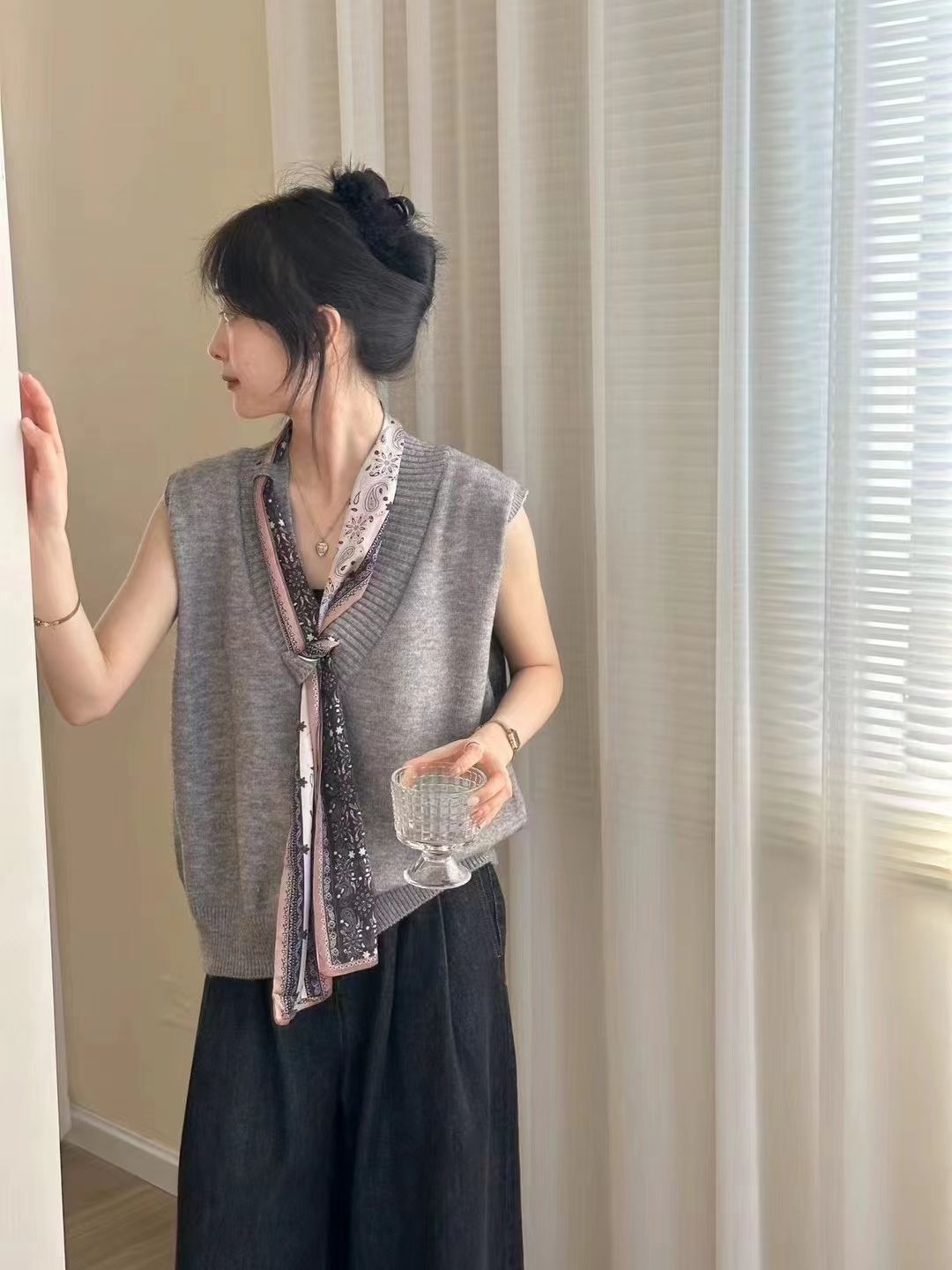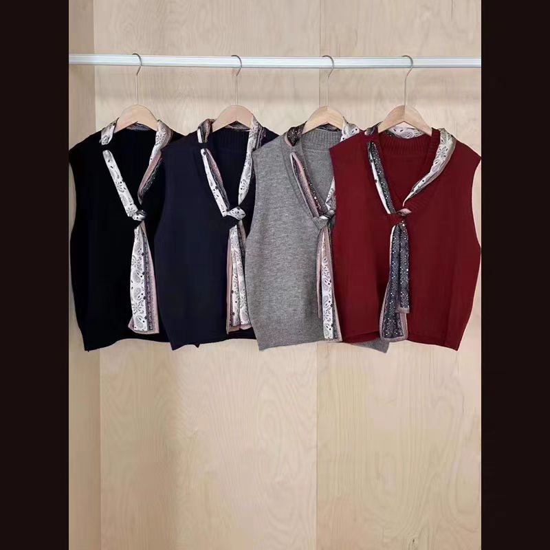 韩系气质知性v领丝巾马甲上衣女秋季设计感洋气显瘦百搭针织背心