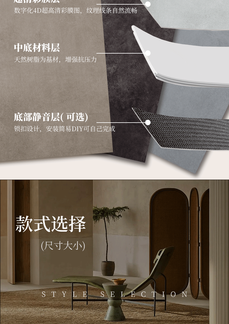 SPC石塑锁扣木地板纯色奶油侘寂风家用微水泥PVC石晶卡扣式地板