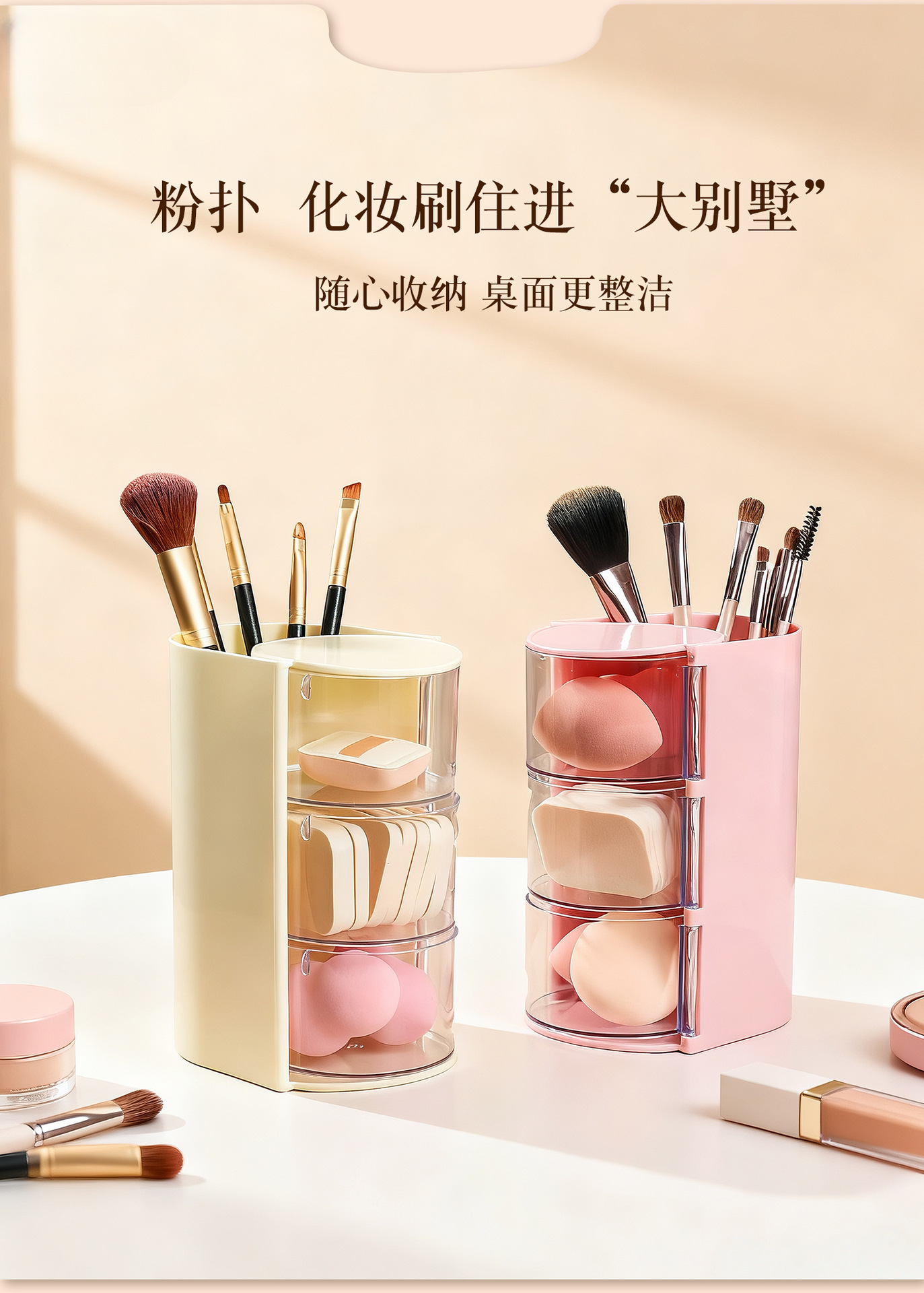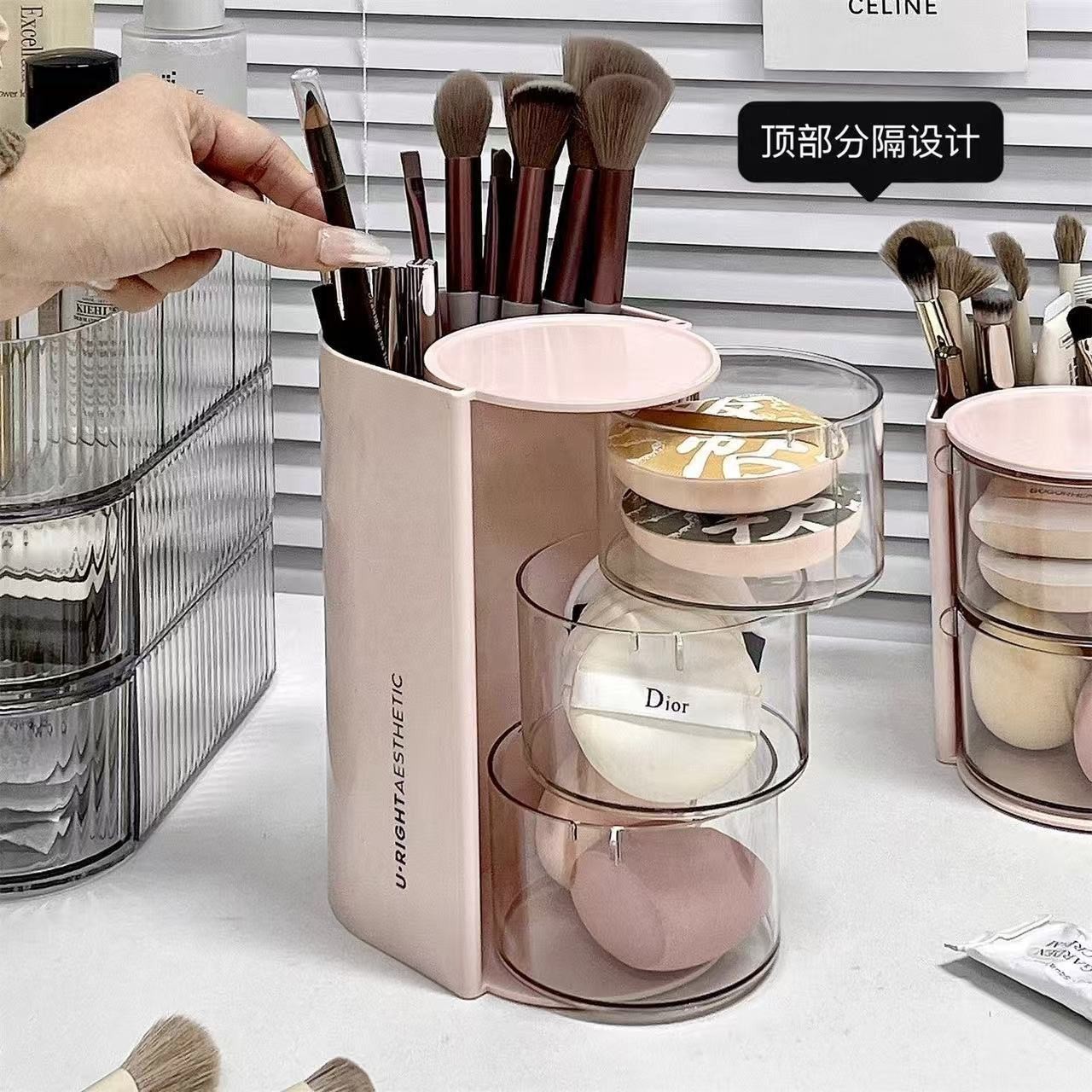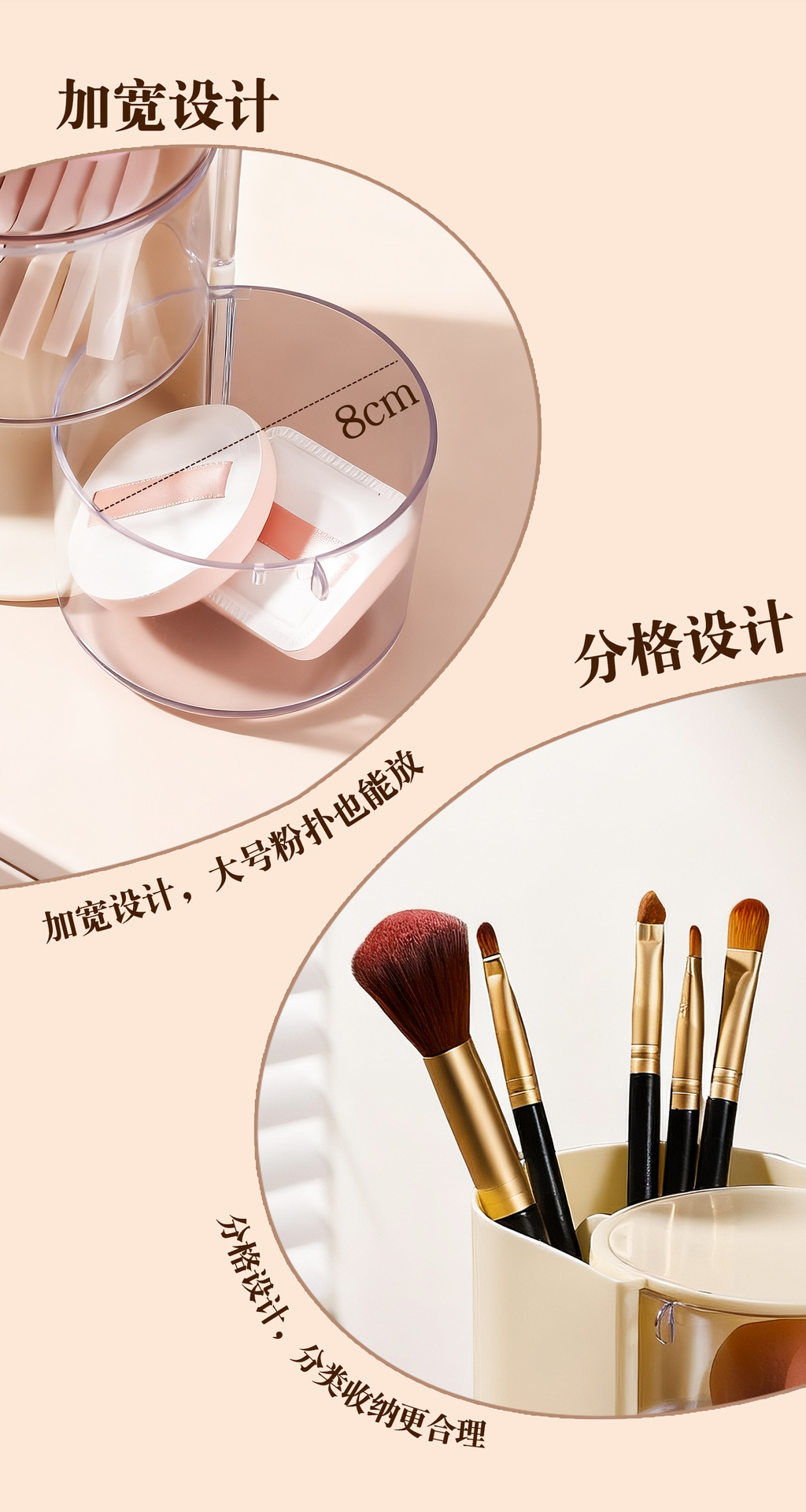 粉扑收纳盒旋转防尘桌面美妆蛋气垫架梳妆台多层口红化妆刷置物架
