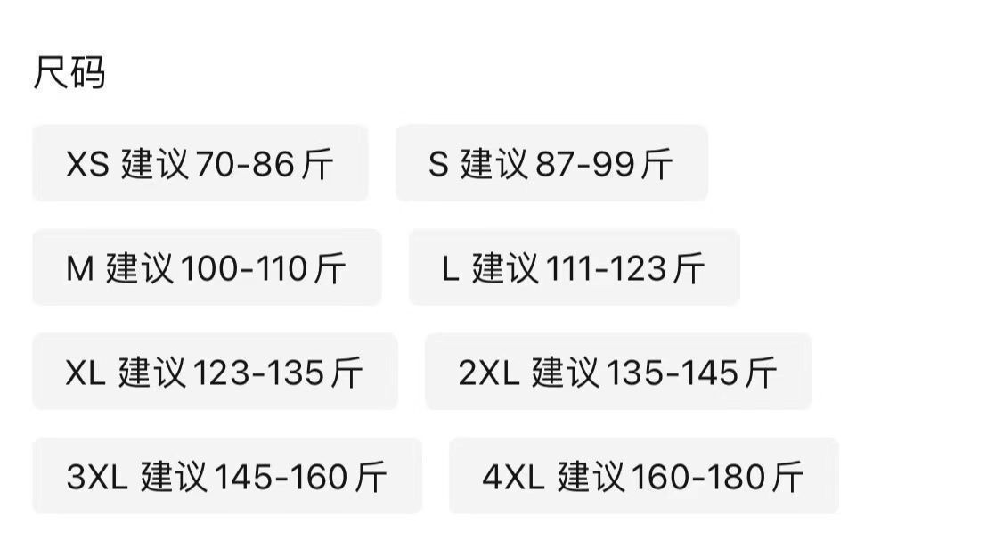 尺码 XS,S,M,L,XL,2XL,3XL,4XL