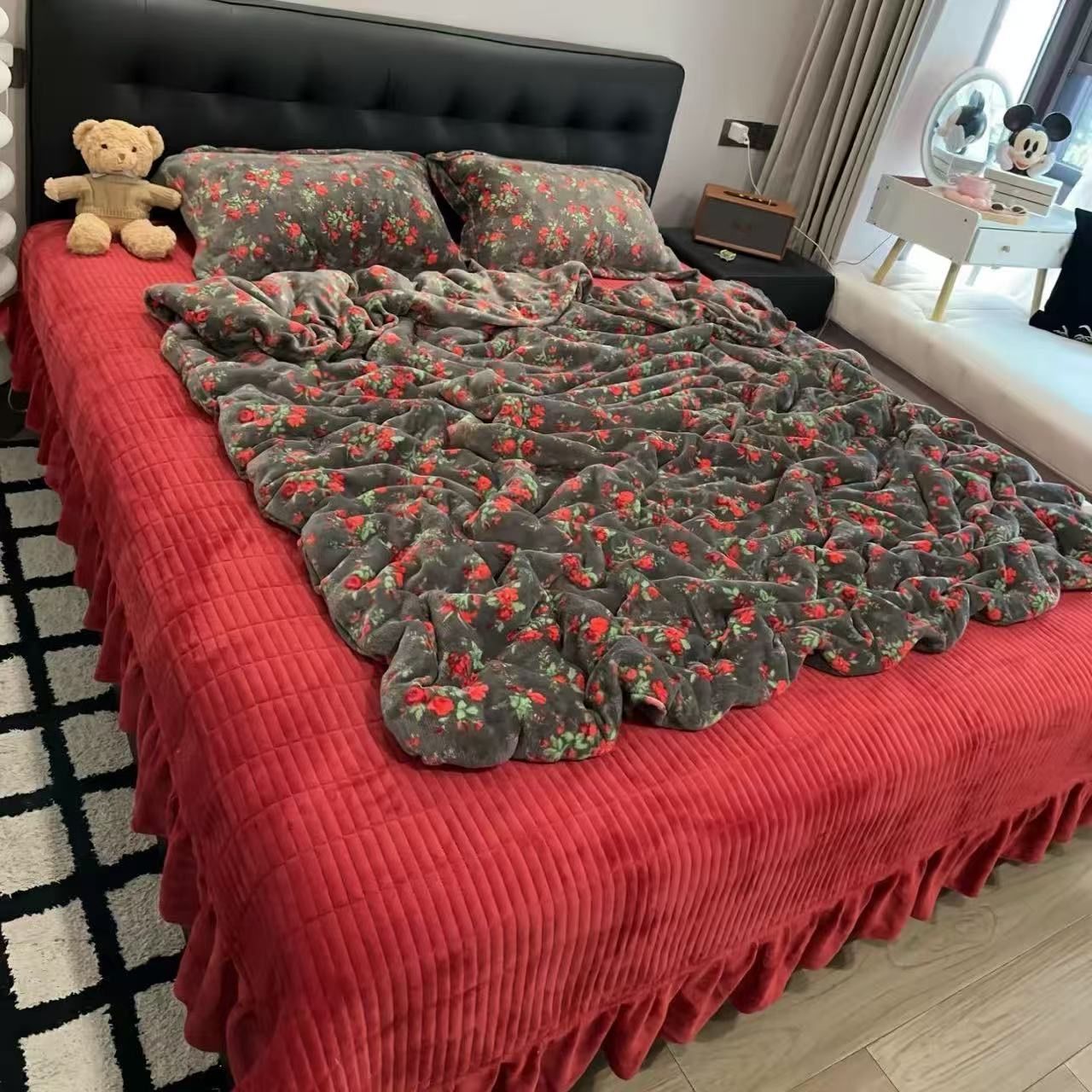 タフのベッドのスカートの単品は厚い牛乳の絨毯の冬の厚いシーツとベルベットの花の縁の金を厚くします。