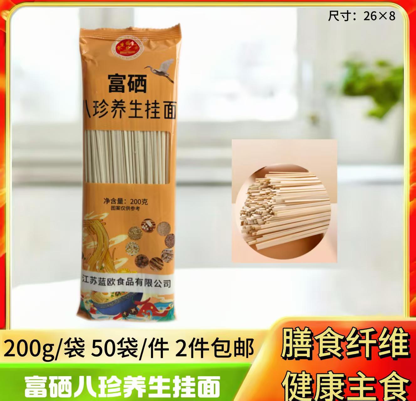 包装规格 铁皮石斛龙须面200g(50袋/件,2件包邮),富硒八宝养生面200g(50袋/件,2件包邮),富硒八珍养生挂面200g(50袋/件,2件包邮),富硒谷朊发酵挂面200g(50袋/件,2件包邮),荞麦藜麦手擀面200g(50袋/件,2件包邮)