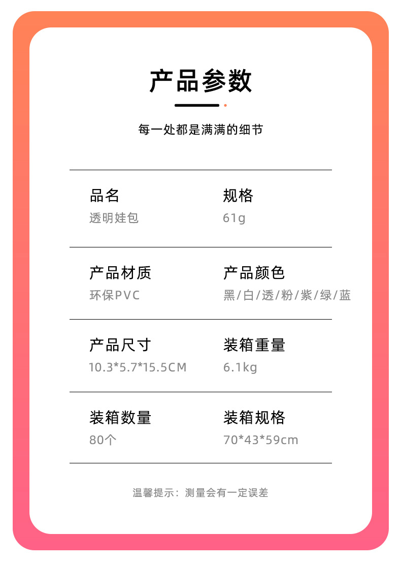 颜色 透明裸包,透明(包+五金扣+毛球),透明(包+挎绳+毛球),透明(包+挎绳+五金扣+毛球),白色裸包,白色(包+五金扣+毛球),白色(包+挎绳+毛球),白色(包+挎绳+五金扣+毛球),黑色裸包,黑色(包+五金扣+毛球),黑色(包+挎绳+毛球),黑色(包+挎绳+五金扣+毛球),粉色裸包,粉色(包+五金扣+毛球),粉色(包+挎绳+毛球),粉色(包+挎绳+五金扣+毛球),绿色裸包,绿色(包+五金扣+毛球),绿色(包+挎绳+毛球),绿色(包+挎绳+五金扣+毛球),蓝色裸包,蓝色(包+五金扣+毛球),蓝色(包+挎绳+毛球),蓝色(包+挎绳+五金扣+毛球),紫色裸包,紫色(包+五金扣+毛球),紫色(包+挎绳+毛球),紫色(包+挎绳+五金扣+毛球)