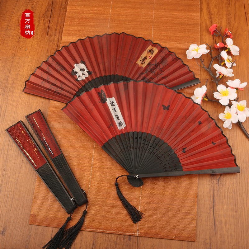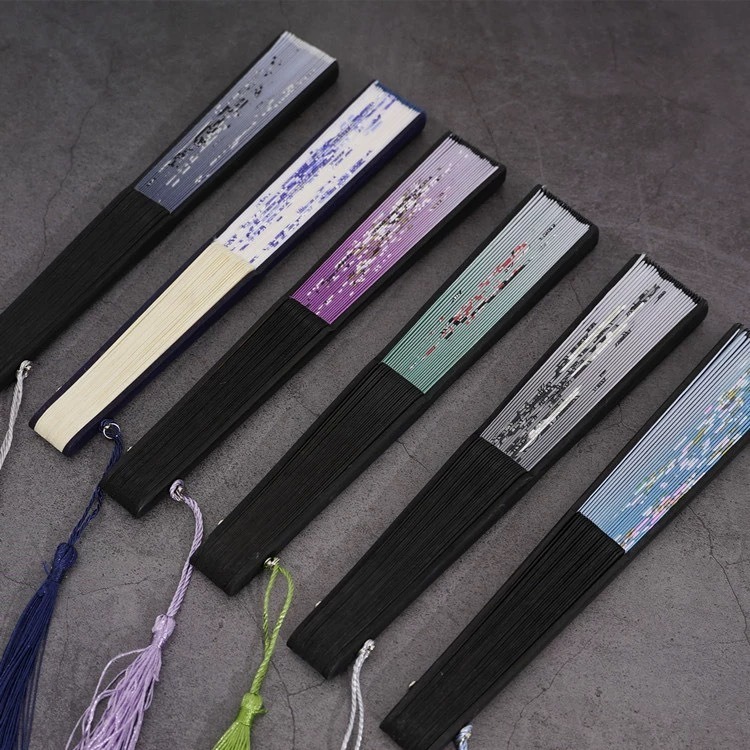 古代スタイルの古典的な折りたたみシルクファン、新しい中国風の文学風の折りたたみファン、国民的トレンドのポータブルタッセルペンダント、学生竹ファン