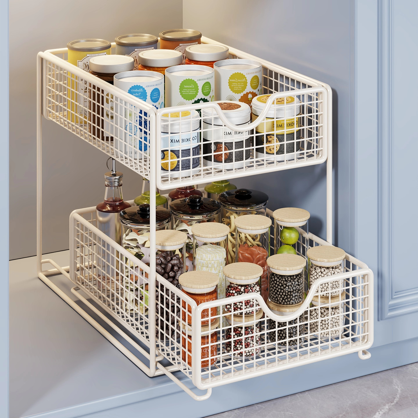カスタマイズ可能な引き出し式スナック収納バスケット、多層キッチン収納ラック、調味料ボトル収納ラック、分層収納バスケット