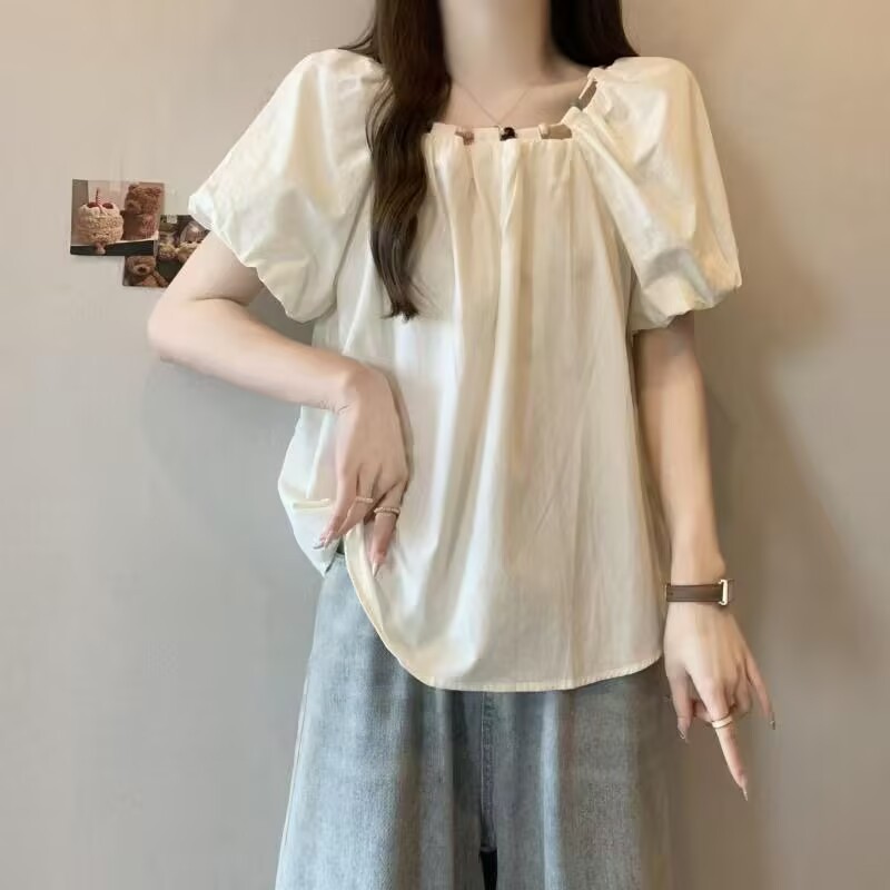 デザインビーズブルーパフスリーブ半袖シャツ女性夏用