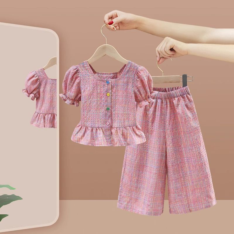 女の子サマースーツ 2025 新しい子供スタイルサマースーツ少女チェック柄シャツワイドレッグパンツツーピーストレンディセット