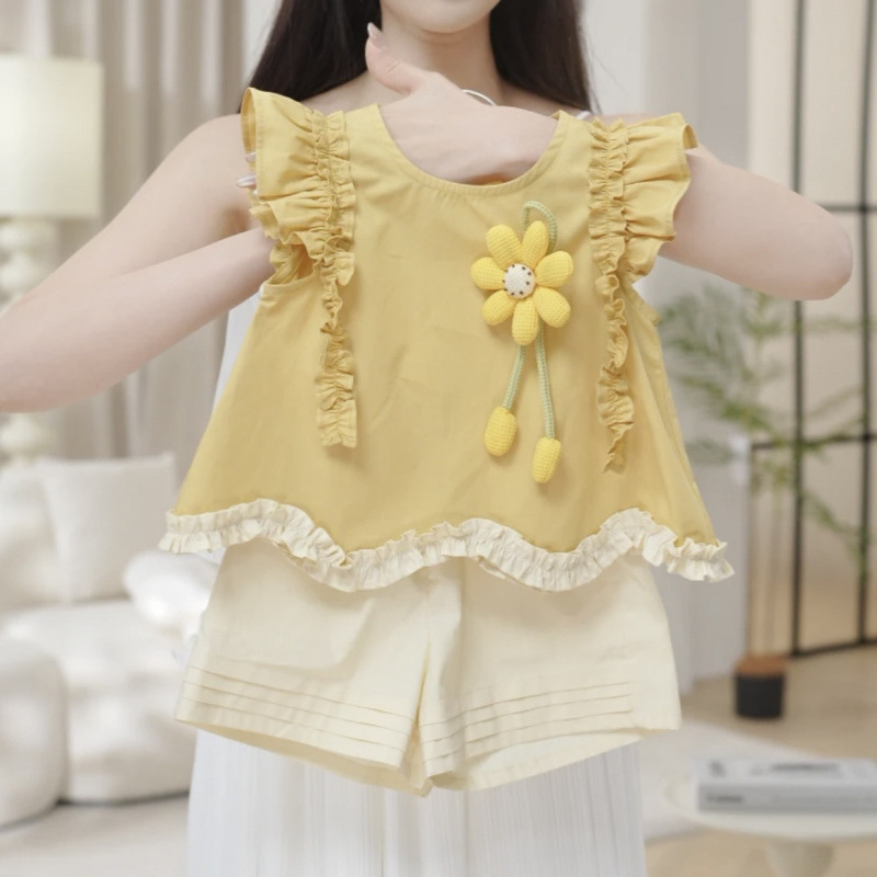女の子の新しい2025夏の女の赤ちゃん黄色の立体ひまわりノースリーブスタイルショートスカートとショーツスーツ2点セット
