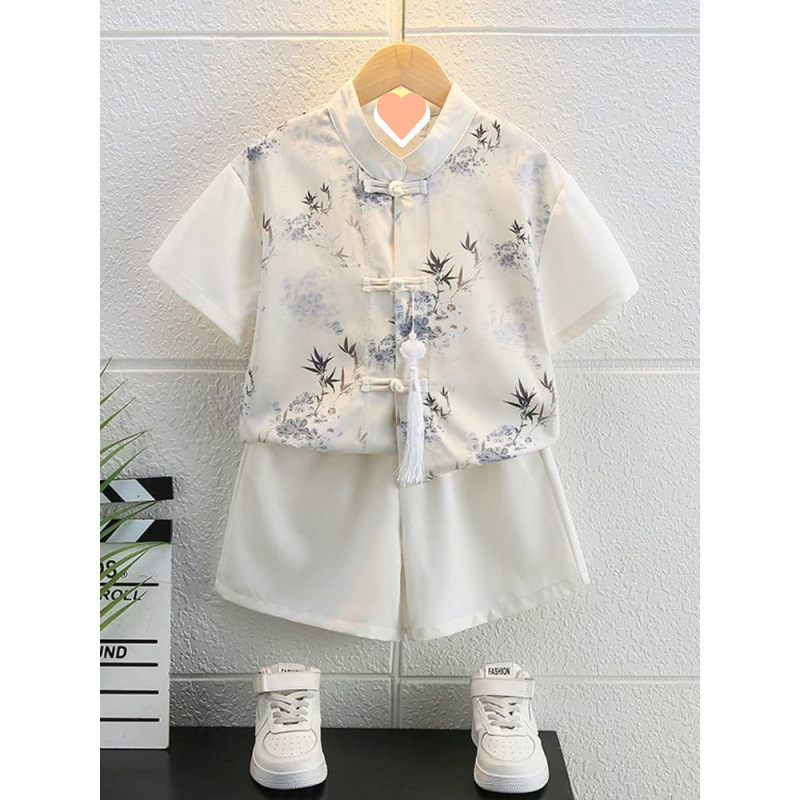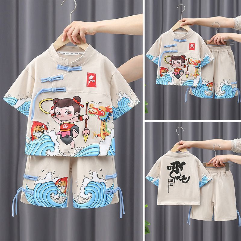 子供の漢服夏半袖スーツネザ服男の子中国風夏服少女新中国風薄い唐スーツ