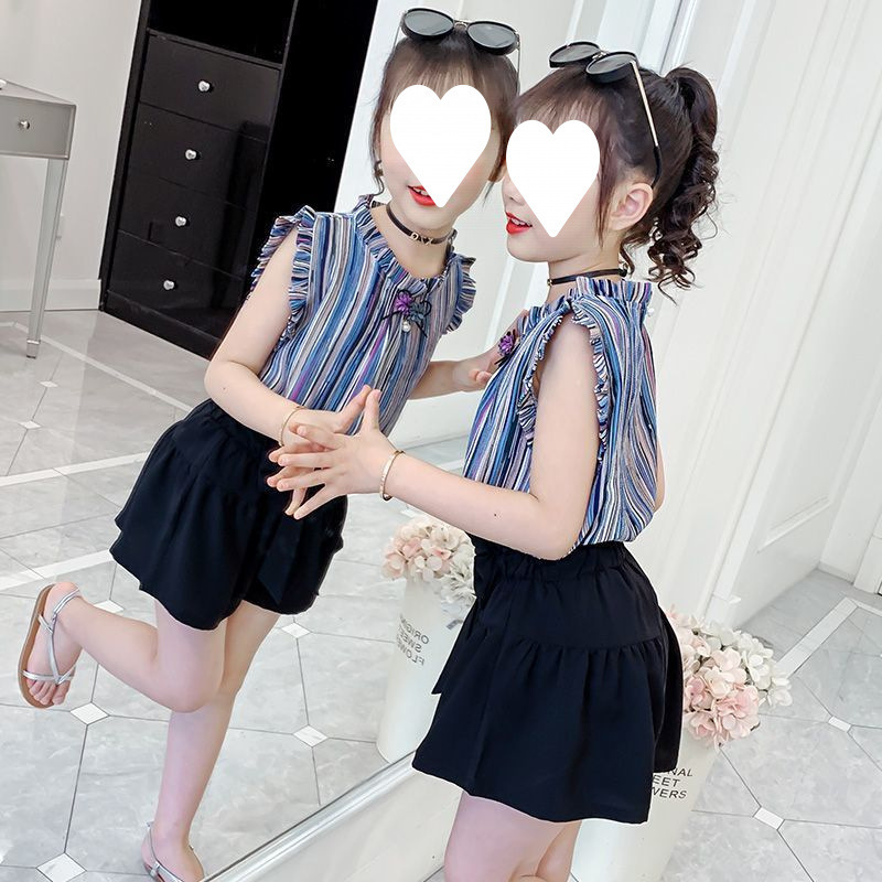 女の子の夏服スーツ、新しいスタイルの子供服、大きな子供の夏のおしゃれな女の子のネットセレブツーピース子供服
