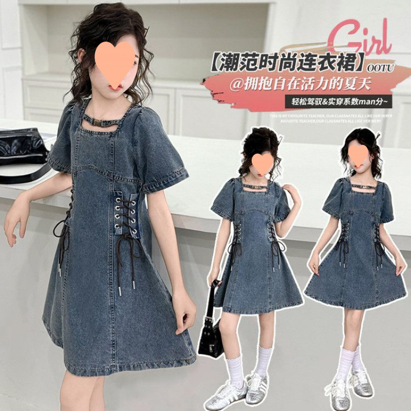 女の子の夏のデニム半袖ドレス 2025 新しい中型と大型の子供のファッショナブルな子供のカジュアルデニムスカート