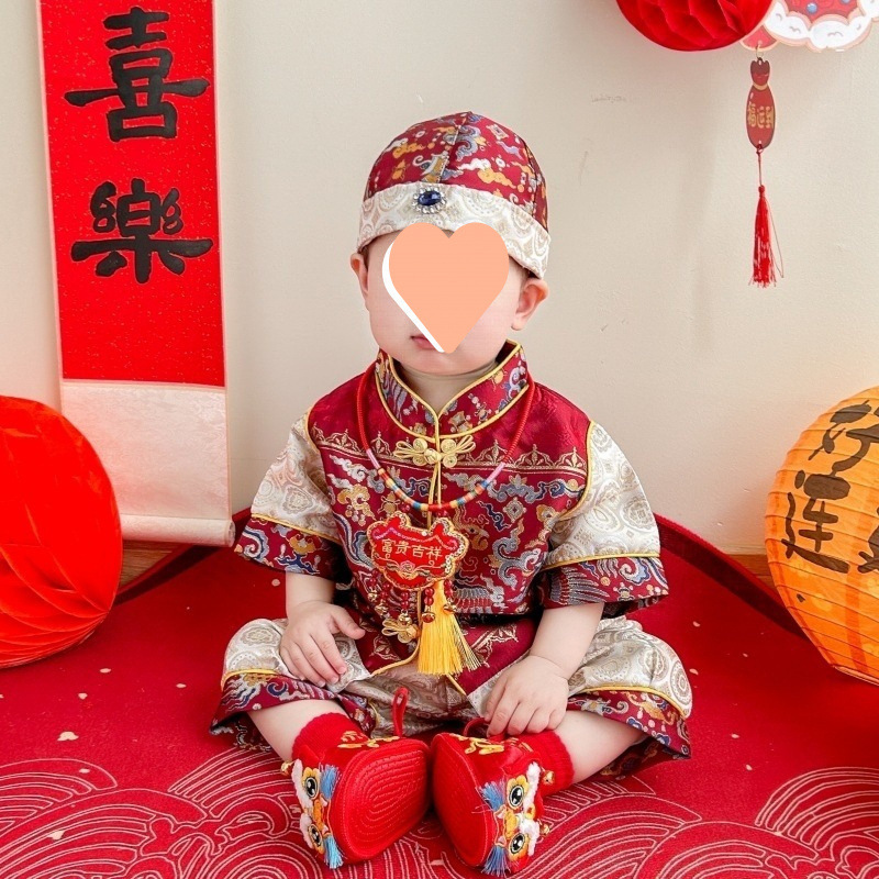 男の子の夏の新しい1歳のドレス、男の子の誕生日パーティーのドレス、新しい中国風の唐スーツ