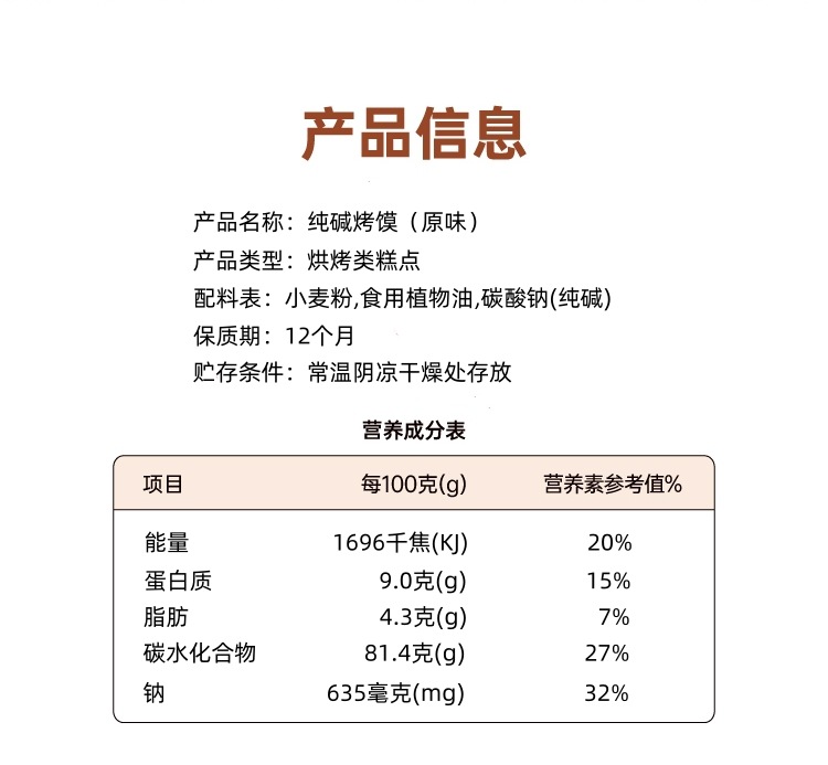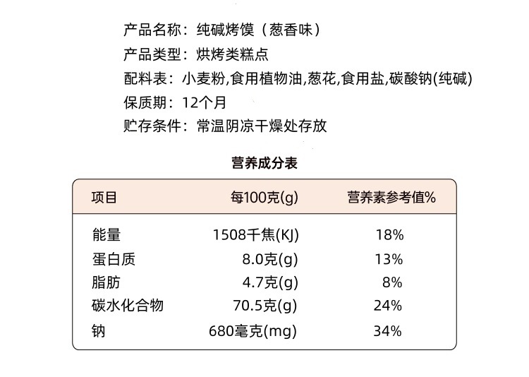 包装规格 原味纯碱烤馍100克(一袋),原味纯碱烤馍250克(一袋),原味纯碱烤馍500克(一袋),原原味纯碱烤馍500克(两袋),葱香纯碱烤馍500克(一袋),葱香纯碱烤馍500克(两袋),混合装纯碱烤馍500克(两袋)