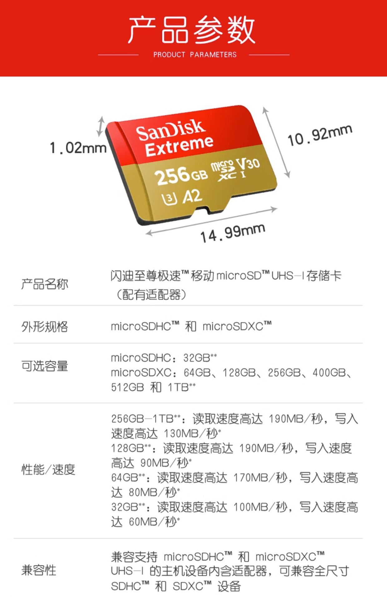 32GB—TF/120M/s,64GB—TF/140M/s,128GB—TF/140M/s,256G—TF/150M/s,512G—TF/150M/s,1TB