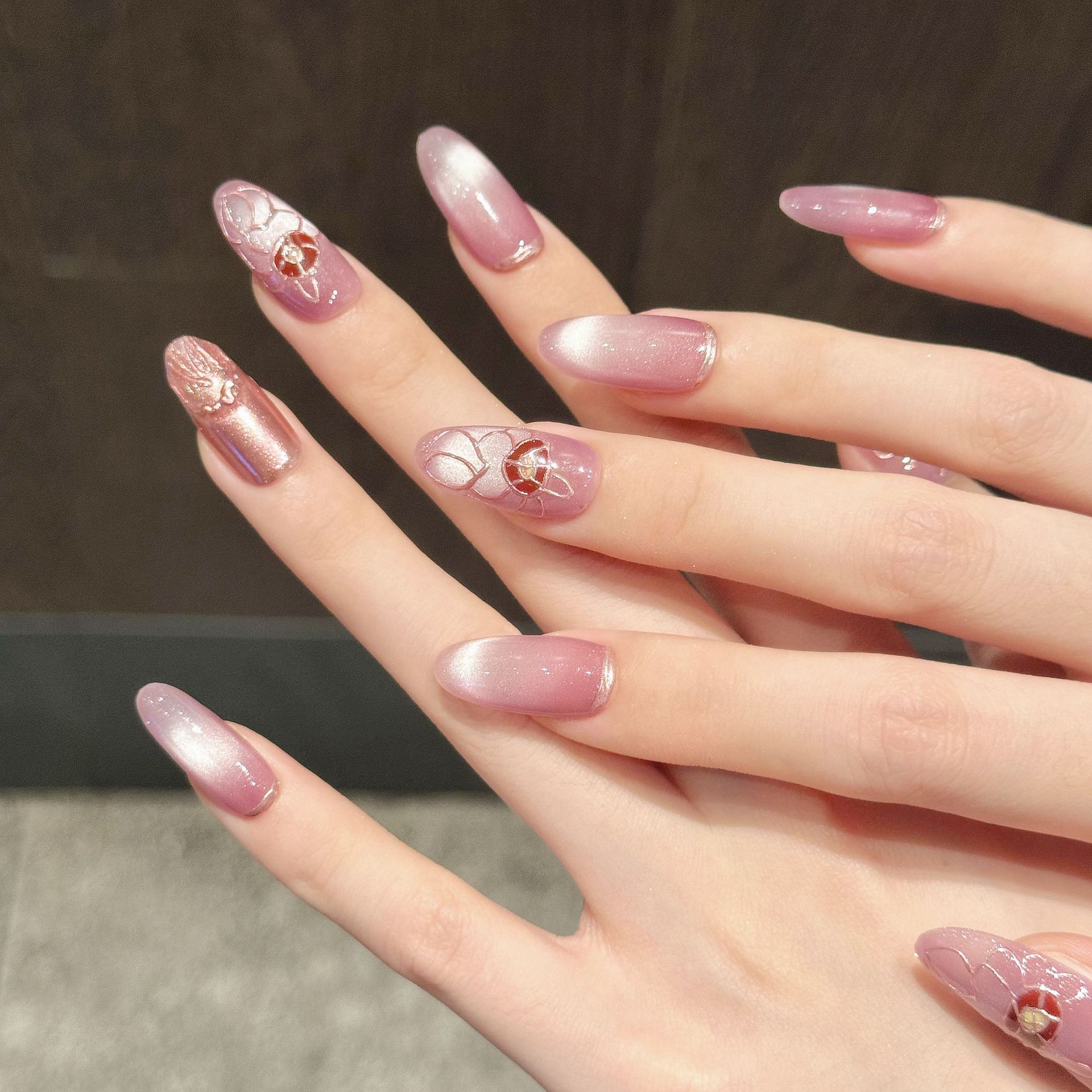 黛瑞森【魅眸】粉色玻璃珠猫眼美甲个性魔镜法式手绘穿戴甲纯手作