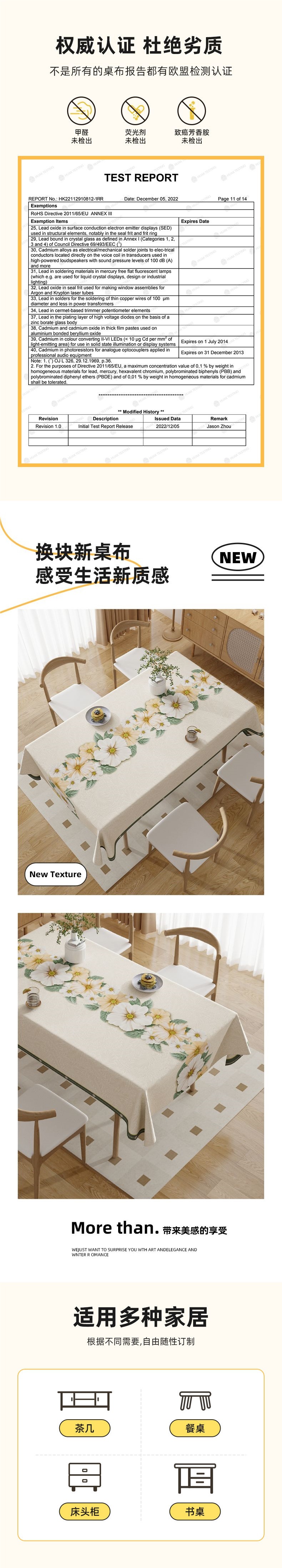 90*150cm (小さなコーヒーテーブルに適しています),100*160cm (コーヒーテーブルに適しています),120*170cm (大きなコーヒーテーブルに適しています),140×140cm(正方形テーブル/小さな円形テーブル),140*180cm (4人掛けテーブルに最適),140*200cm (6人掛けのダイニングテーブルに最適),140*220cm (6人掛けのダイニングテーブルに最適)