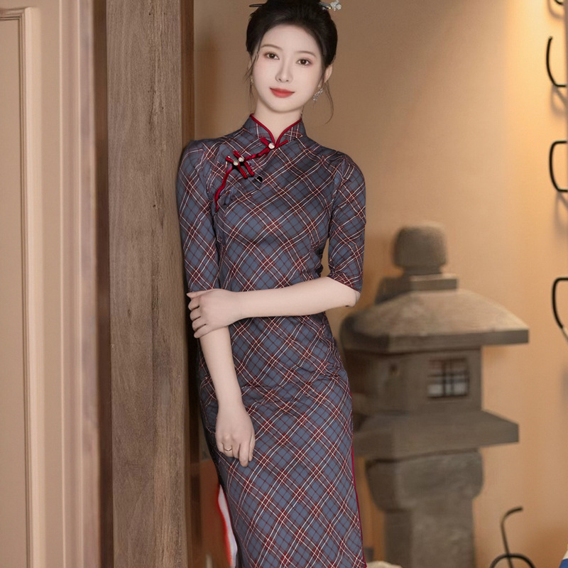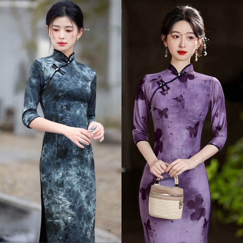 颜色 七分袖长旗袍-灰格,七分袖长旗袍【金步瑶】-酒红,七分袖长旗袍-紫蝶,七分袖长旗袍【水墨花】-黑灰