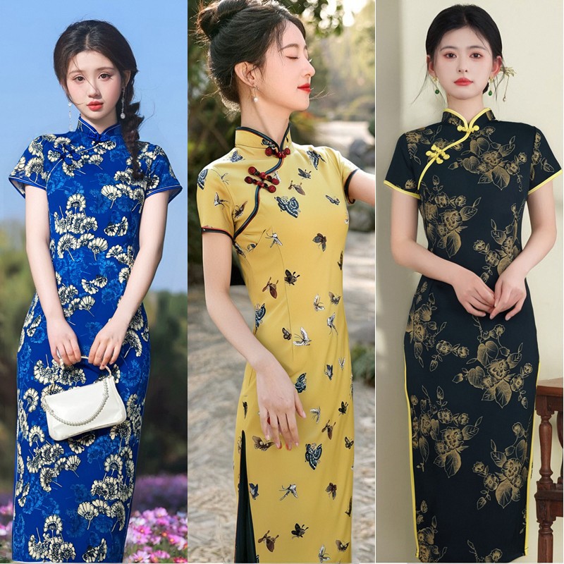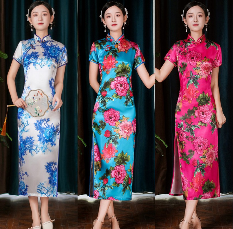 チャイナドレス女性ワンピース半袖ミディアムロング夏改良版中高年ママレトロ演出服チャイナドレス