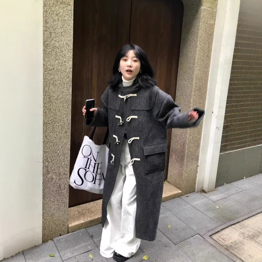 韓国スタイルグレーハイエンドウールコート女性のための 2025 秋と冬の新しいスタイルの小さなホーンボタンフード付きウールコート