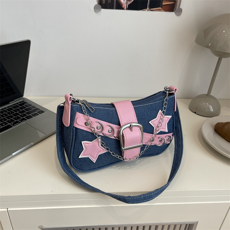 潮流个性2025秋季新款星星休闲牛仔布铆钉链条手提单肩腋下包女包