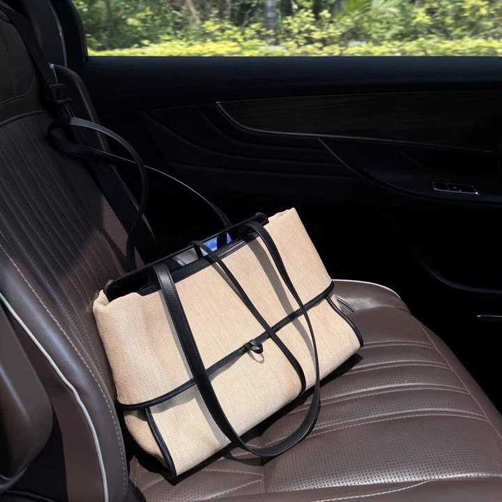 亚麻布单肩包新款时尚大容量简约休闲沙滩包日常百搭设计感拼接包