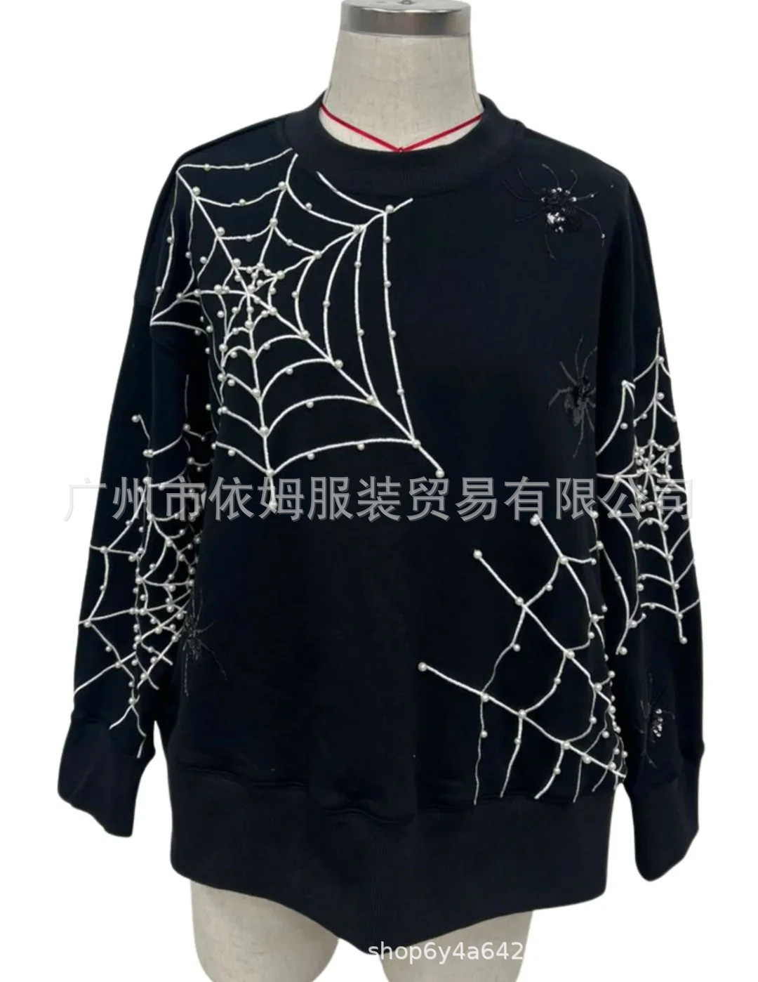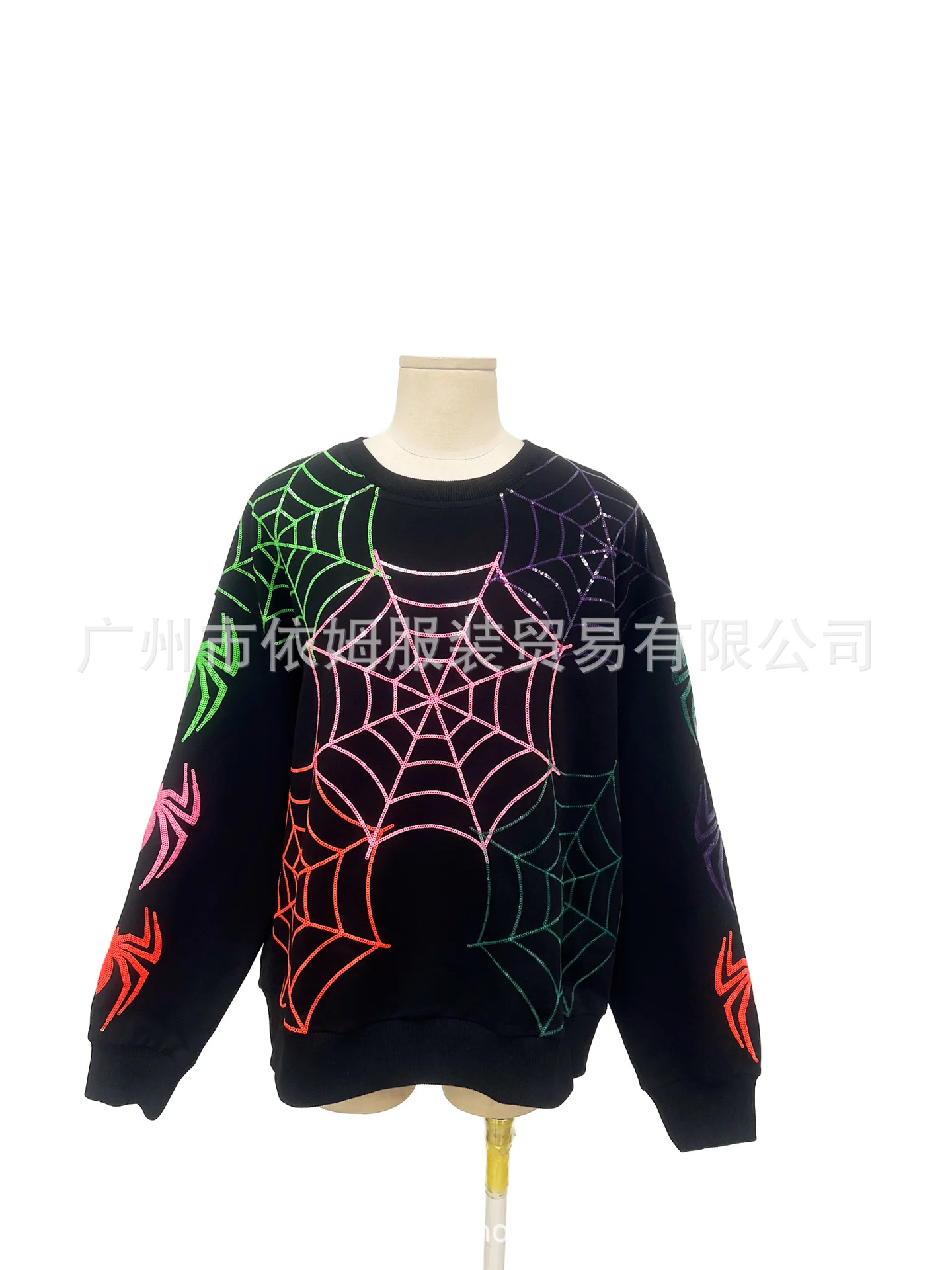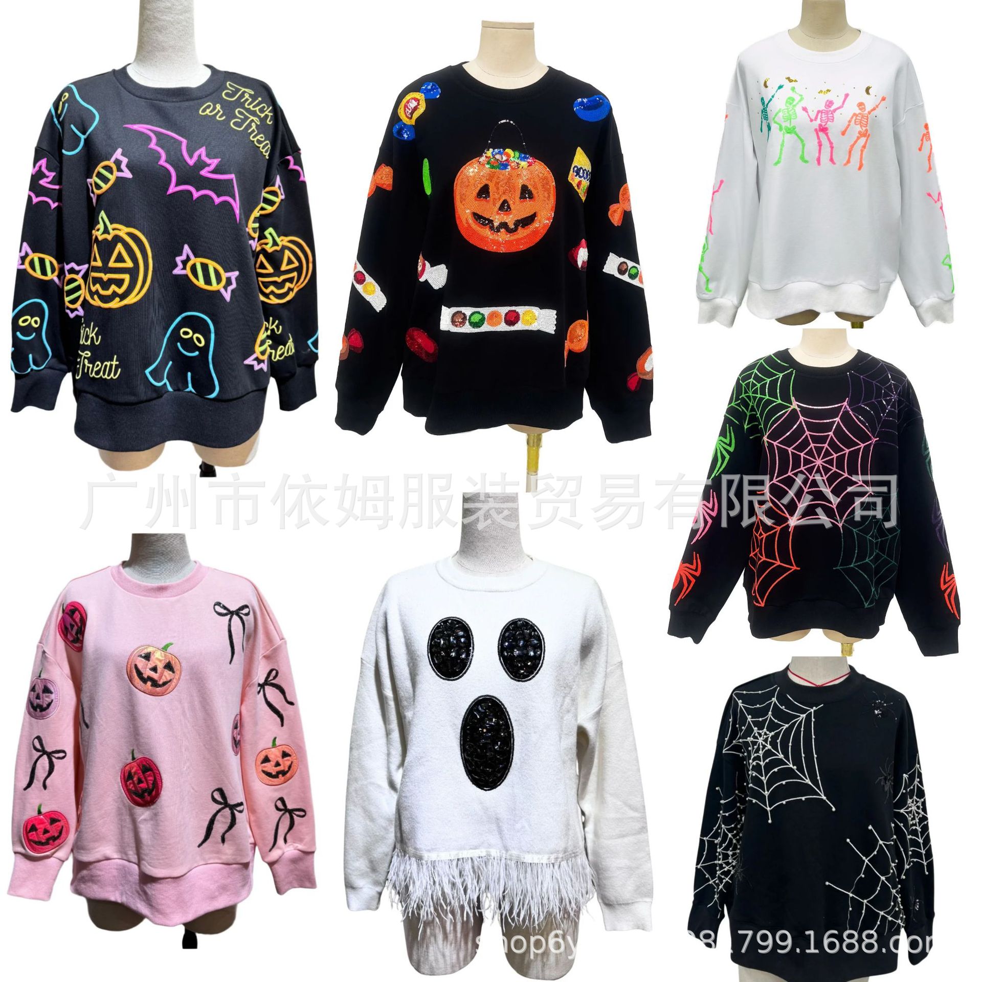 亚马逊25秋冬新款跨境欧美女装万圣节重工刺绣拼接套头长袖卫衣女