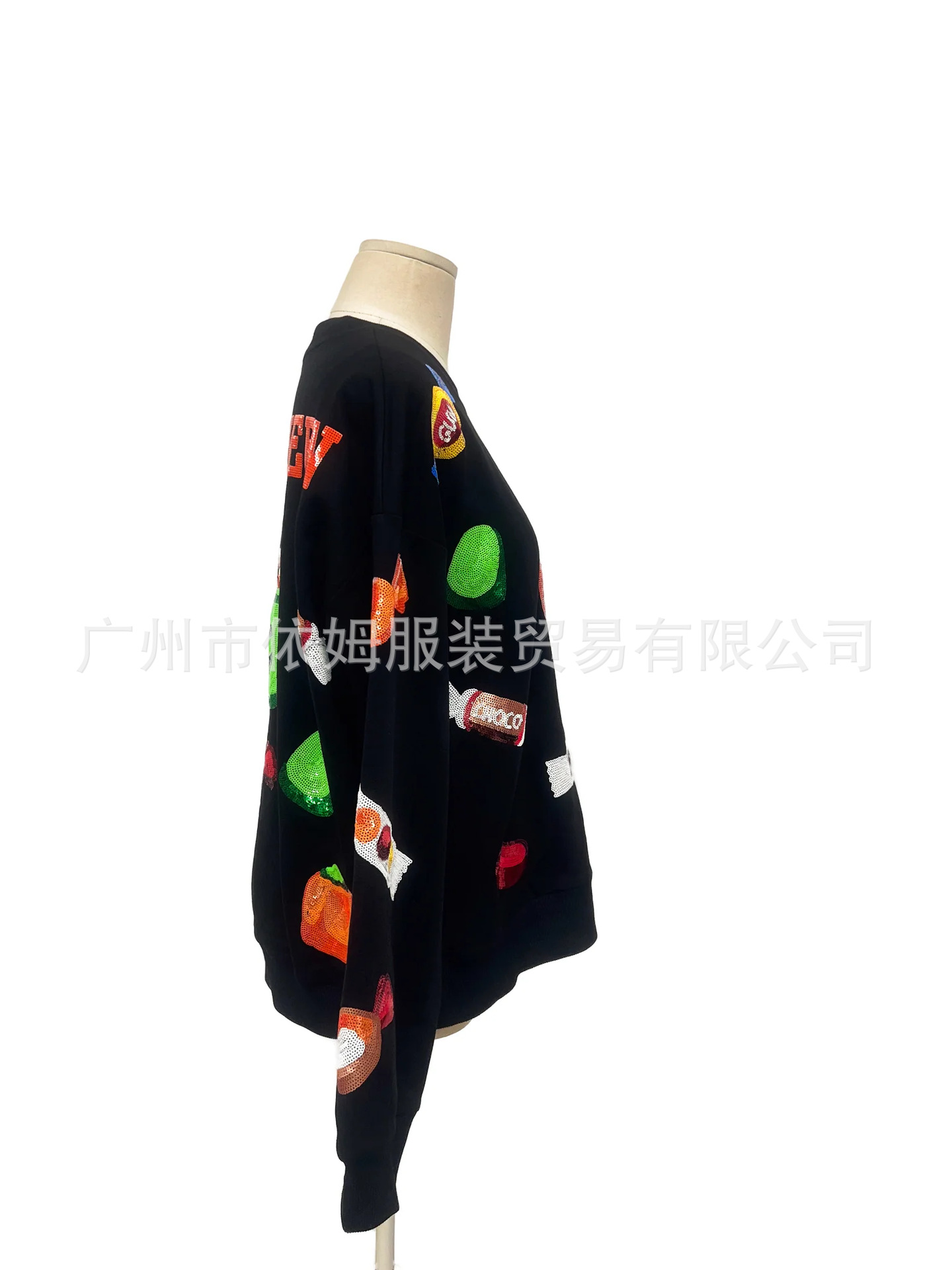 亚马逊25秋冬新款跨境欧美女装万圣节糖果刺绣长袖休闲宽松卫衣女