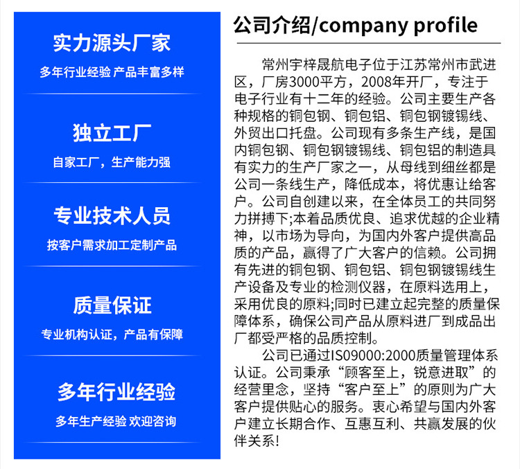 メーカーは0.10~2.0mmの銅被覆アルミニウム線/銅被覆アルミニウムマグネシウム合金裸線、および錫メッキ線を卸売で販売しています。