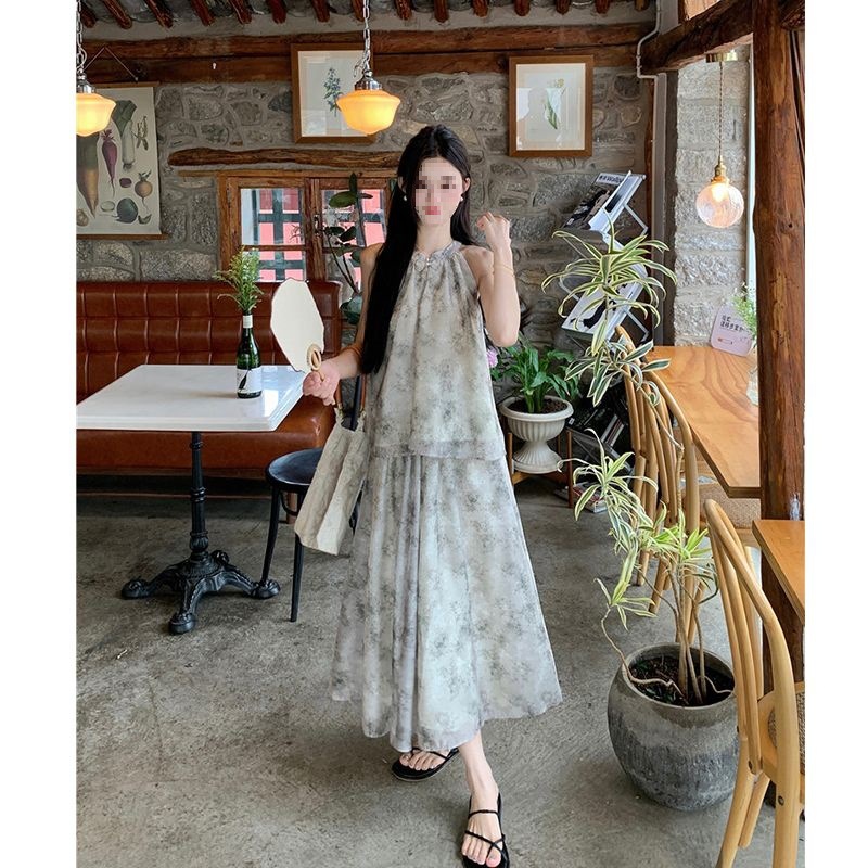 新しい中国風のプリントホルターネックキャミソール女性の夏の新しいハイウエストスカート新しいファッションスーツ