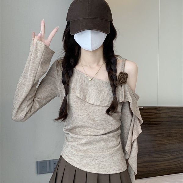 韓国版の不規則な斜め肩のセーターTシャツ、女性用秋の新しい甘い純粋な欲望プリーツフリルフラワートップ
