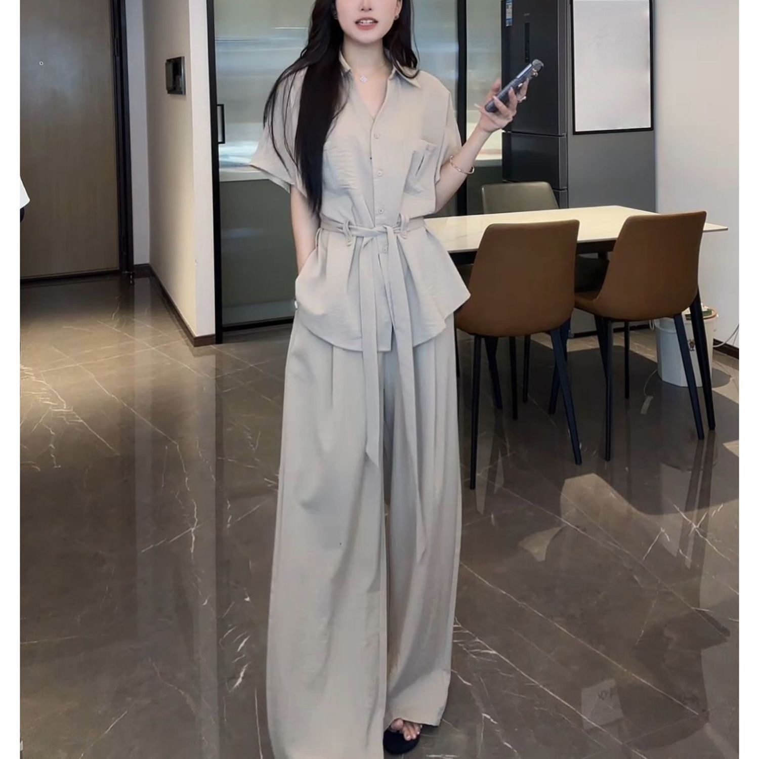 おしゃれなデザインのウエスト痩身スーツ、夏の新作半袖トップス、ハイウエストワイドパンツ、カジュアルツーピーストレンドセット