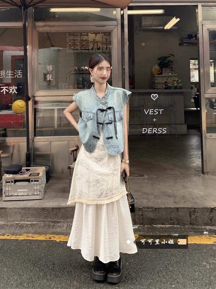 新しい中国風のボタン付きデニムベスト、フェイクツーピースデザインサスペンダードレス、レディースファッションスーツ、トレンディ