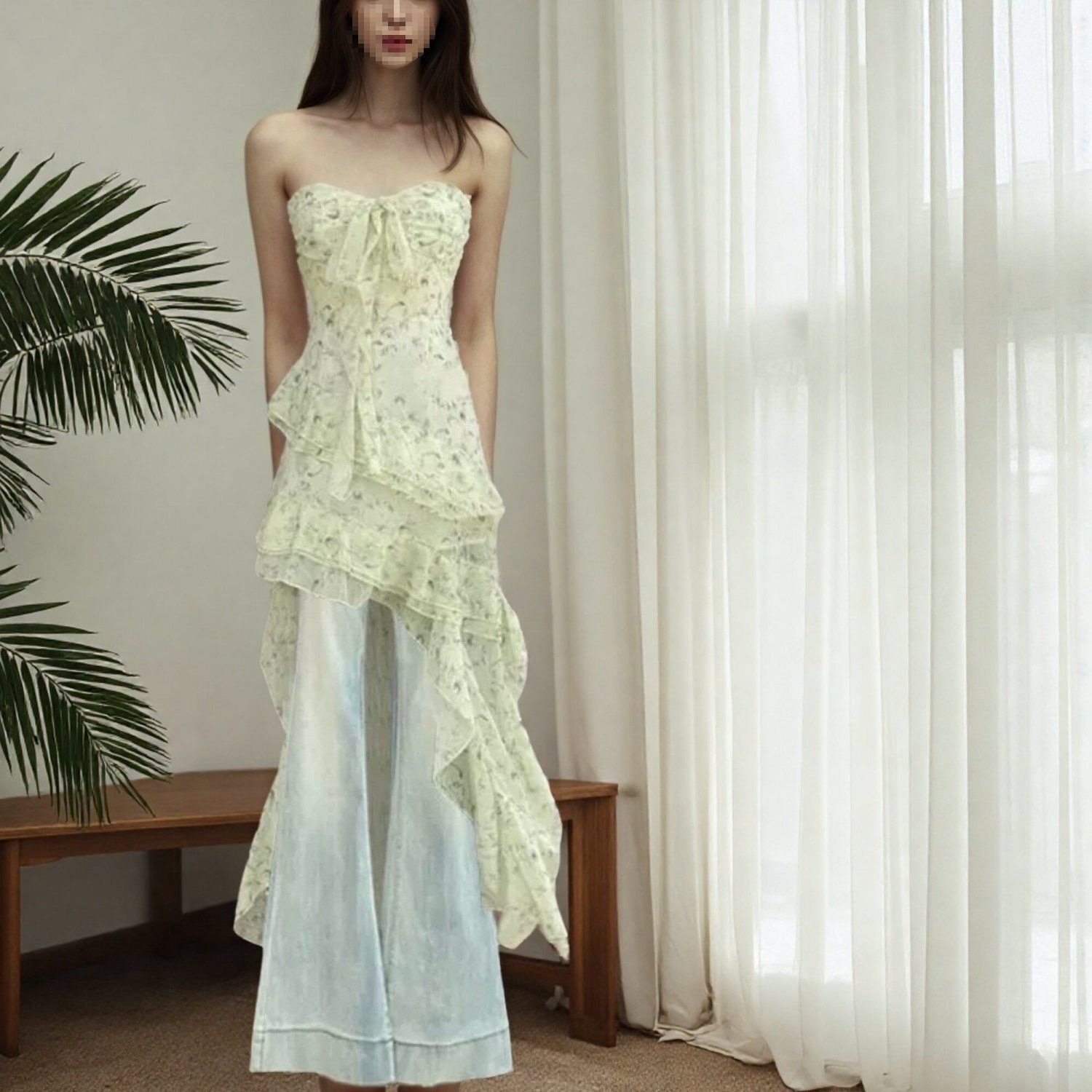 2025年夏の新しい韓国風不規則花柄ドレスとマイクロフレアジーンズの2点セット