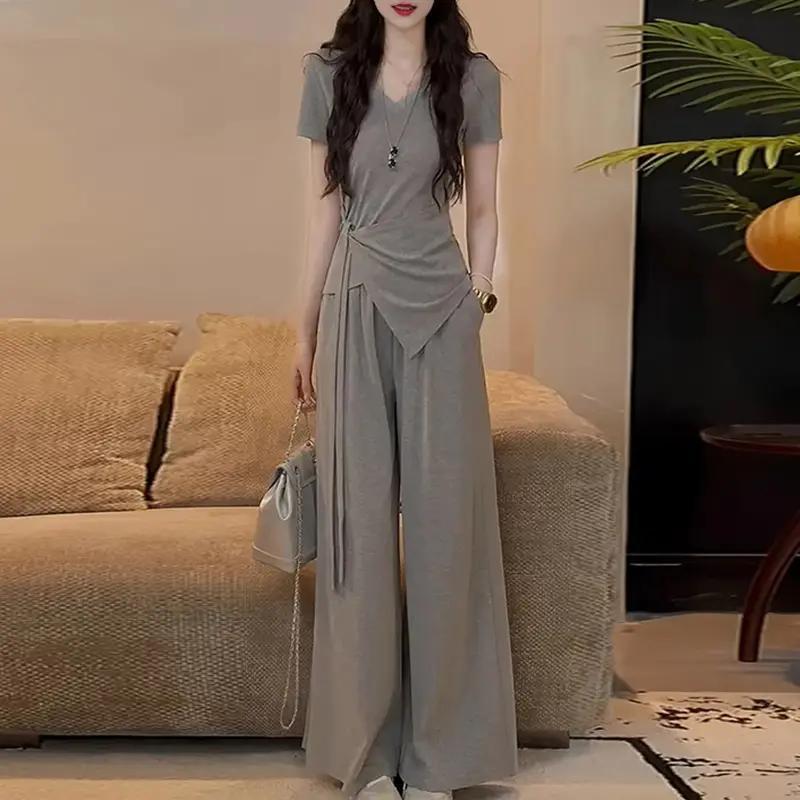 2025年夏の新作シックな半袖レースアップトップスカジュアルワイドレッグパンツツーピーススーツトレンディ