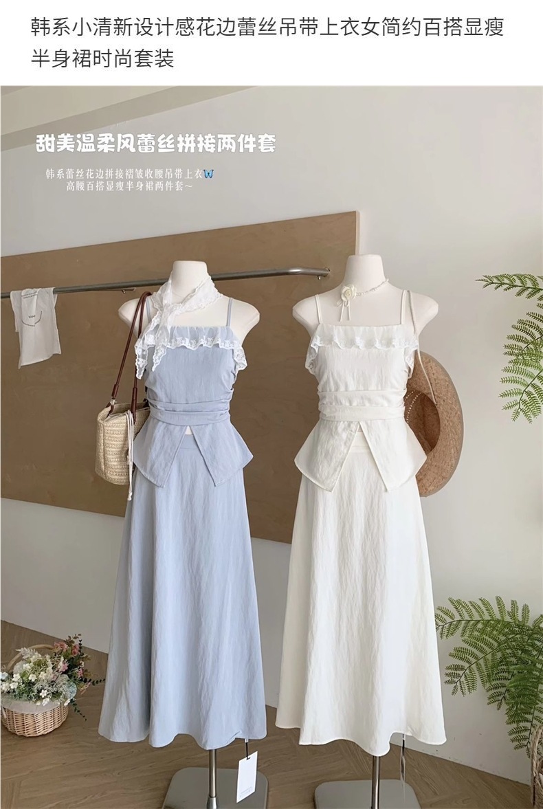 韓国の小さな新鮮なデザインのレースサスペンダートップ女性用、シンプルで多用途なスリムスカートファッションスーツ