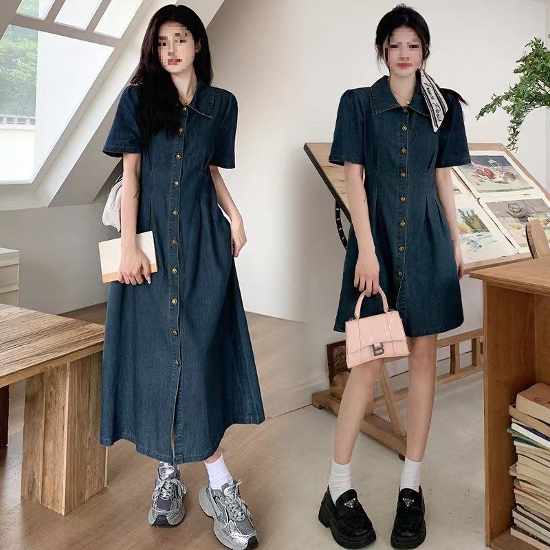 大きいサイズの女性用半袖デニムドレス、夏の新しいスタイル、レトロなブレストプリーツウエスト、スタイリッシュでスリムなミドル丈スカート