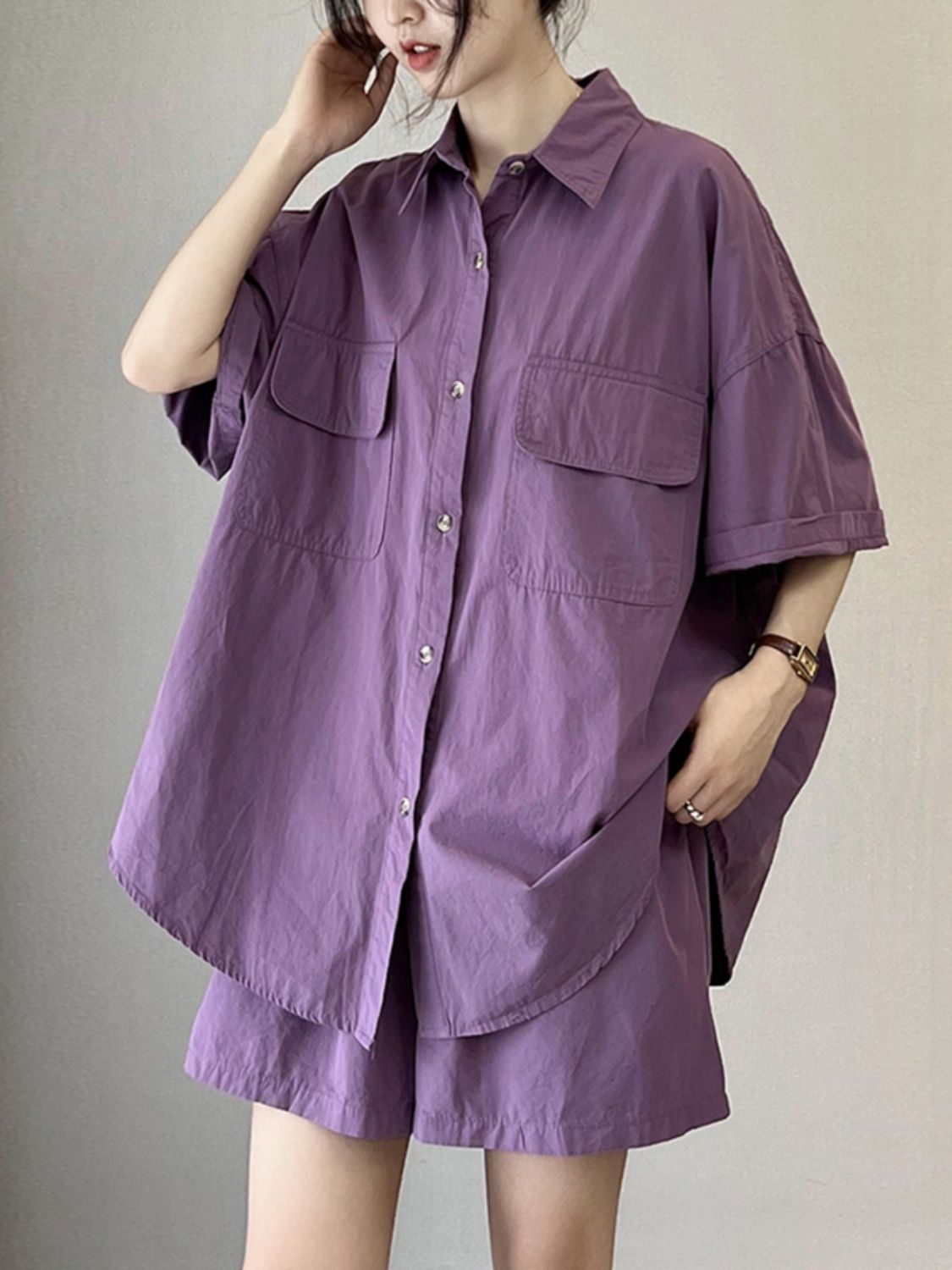 韓国風の女性用ゆったりカジュアルスーツ、夏の女性用無地シャツ、女性用万能ショートパンツ、女性用ゆったりスリム2点セット
