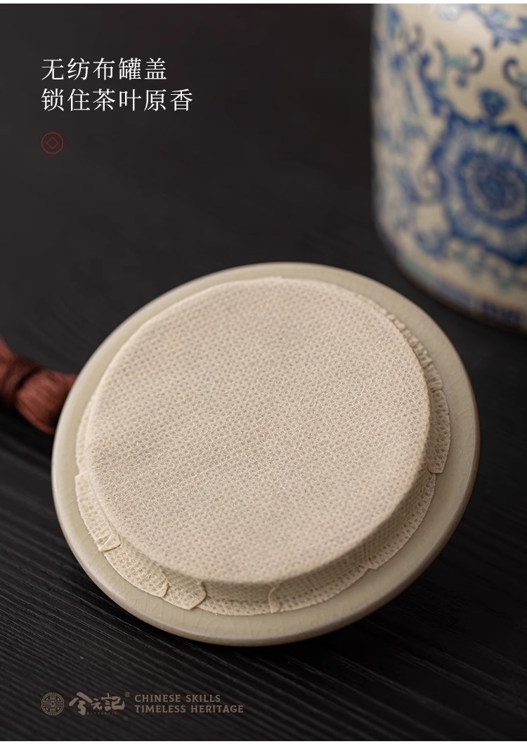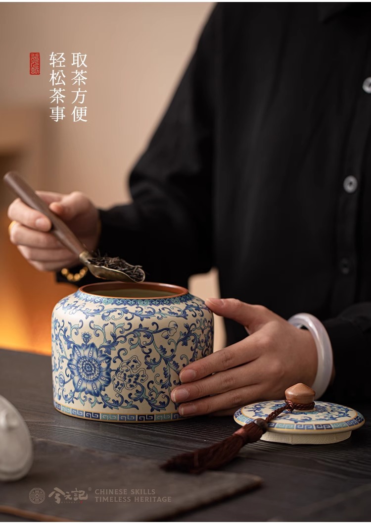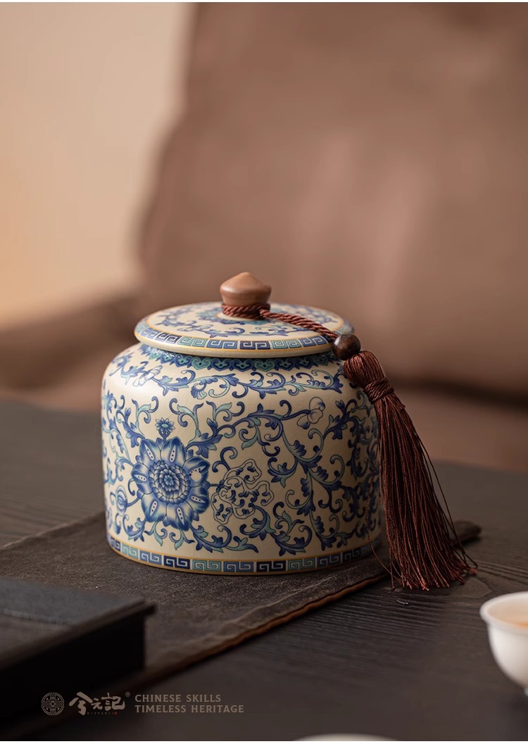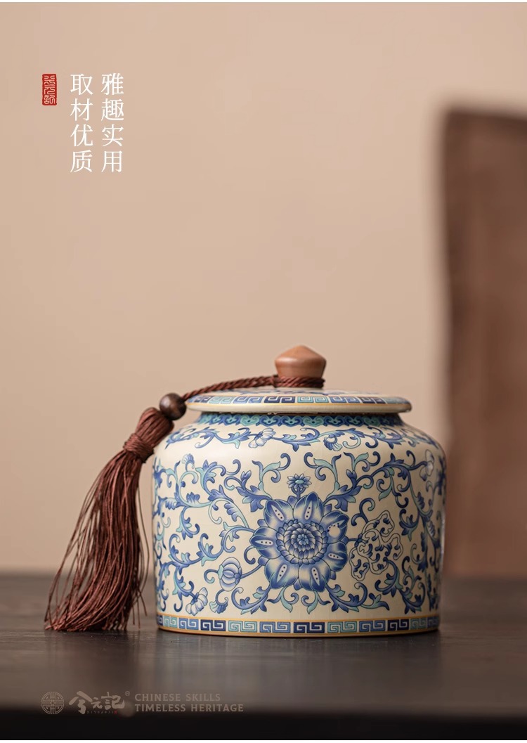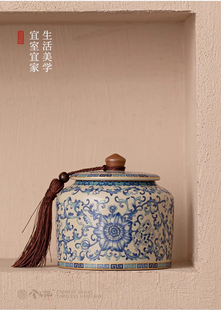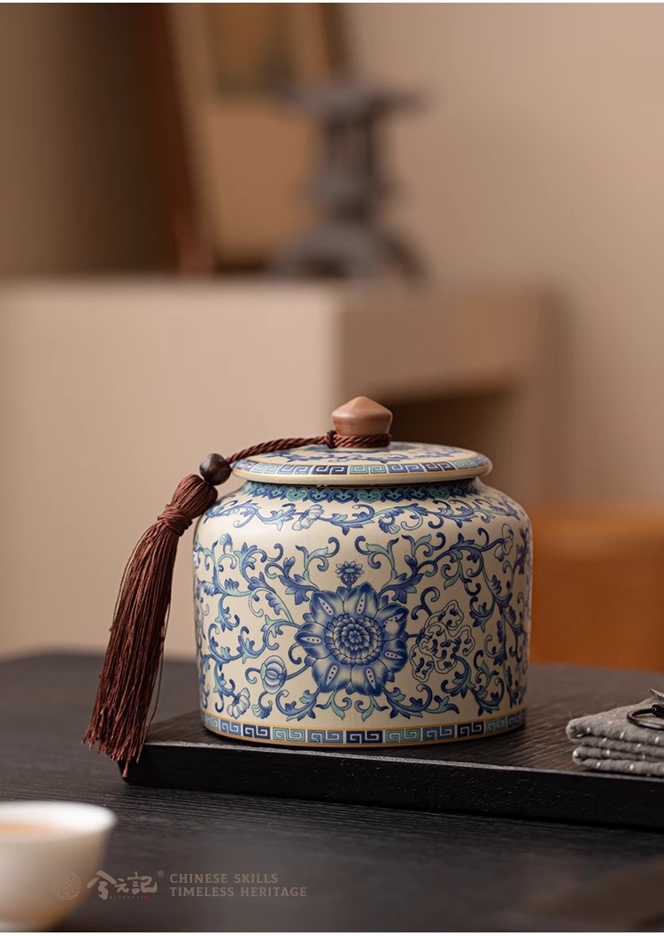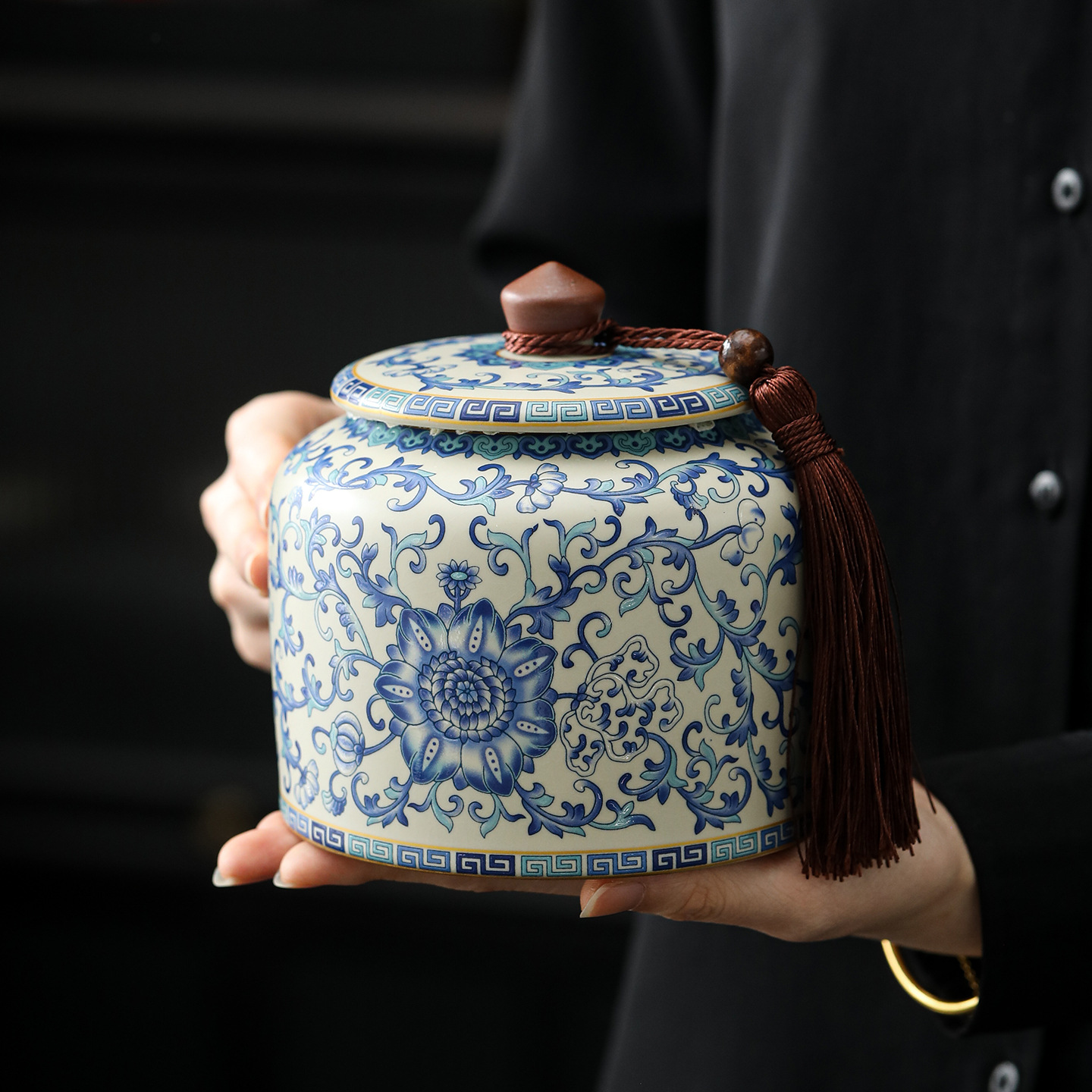 青花汝窯陶磁器茶葉缶逸品高級緑茶白茶プーアル茶防湿缶中国式密封貯蔵タンク