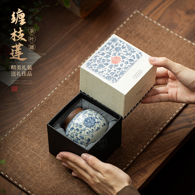 青花瓷茶叶罐密封小罐子缠枝莲迷你陶瓷存茶罐茶叶包装礼盒定制