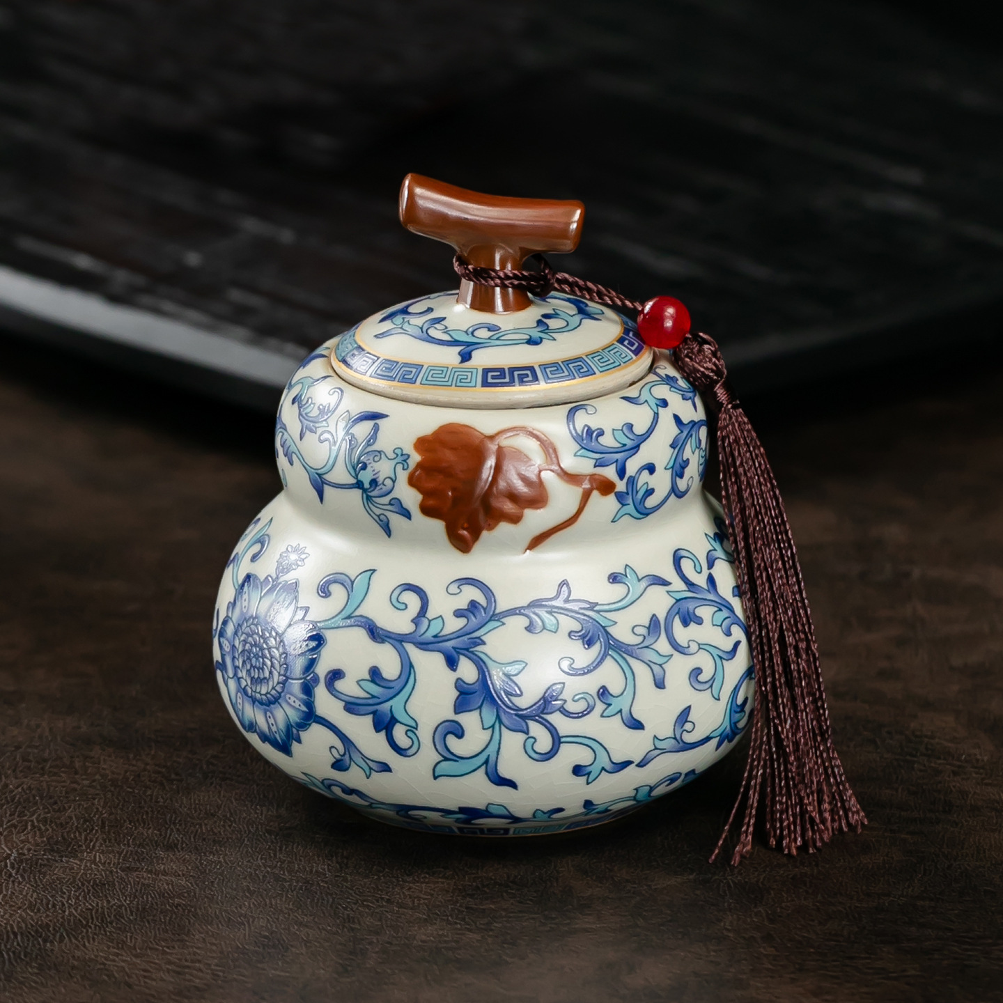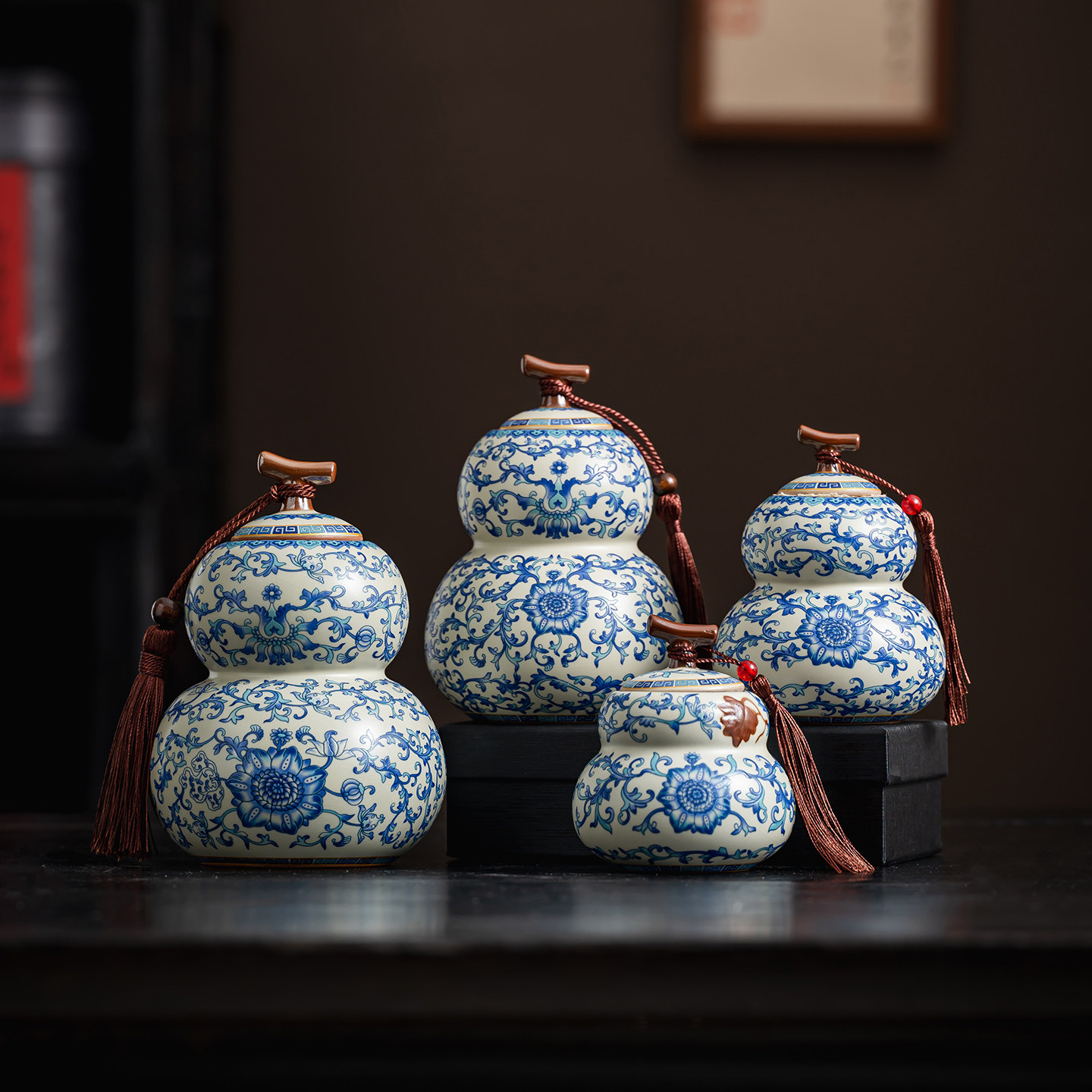 复古青花汝窑葫芦茶叶罐家用陶瓷密封储物罐便携茶仓高档伴手礼物