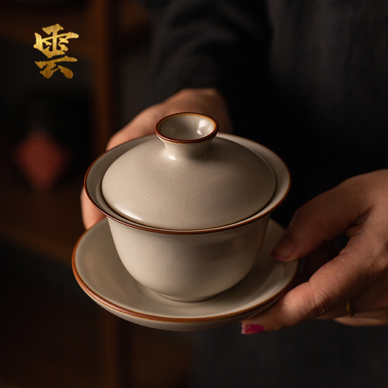米黄汝窯防熱三才蓋碗茶杯単一高級セット茶器家庭用茶碗蓋付き茶功