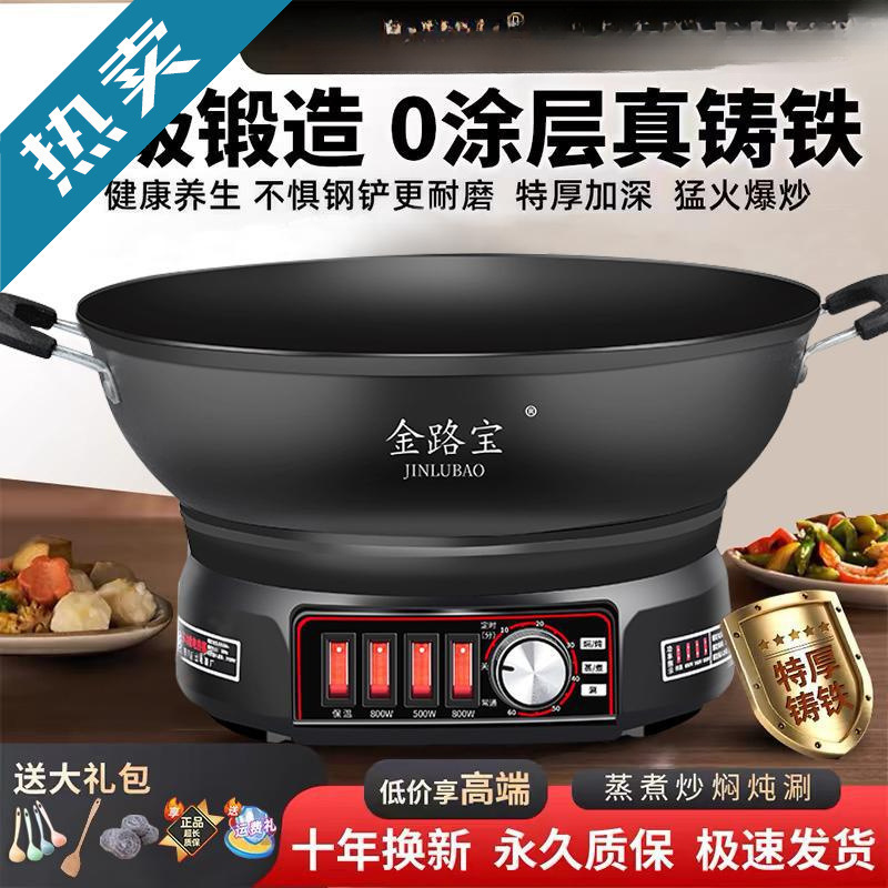 電気中華鍋 鋳鉄製 無塗装ノンスティック鍋 家庭用多機能炒め物・蒸し物 オールインワン電気蒸し器 電気鍋
