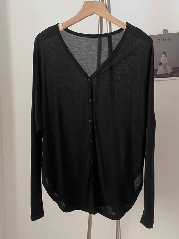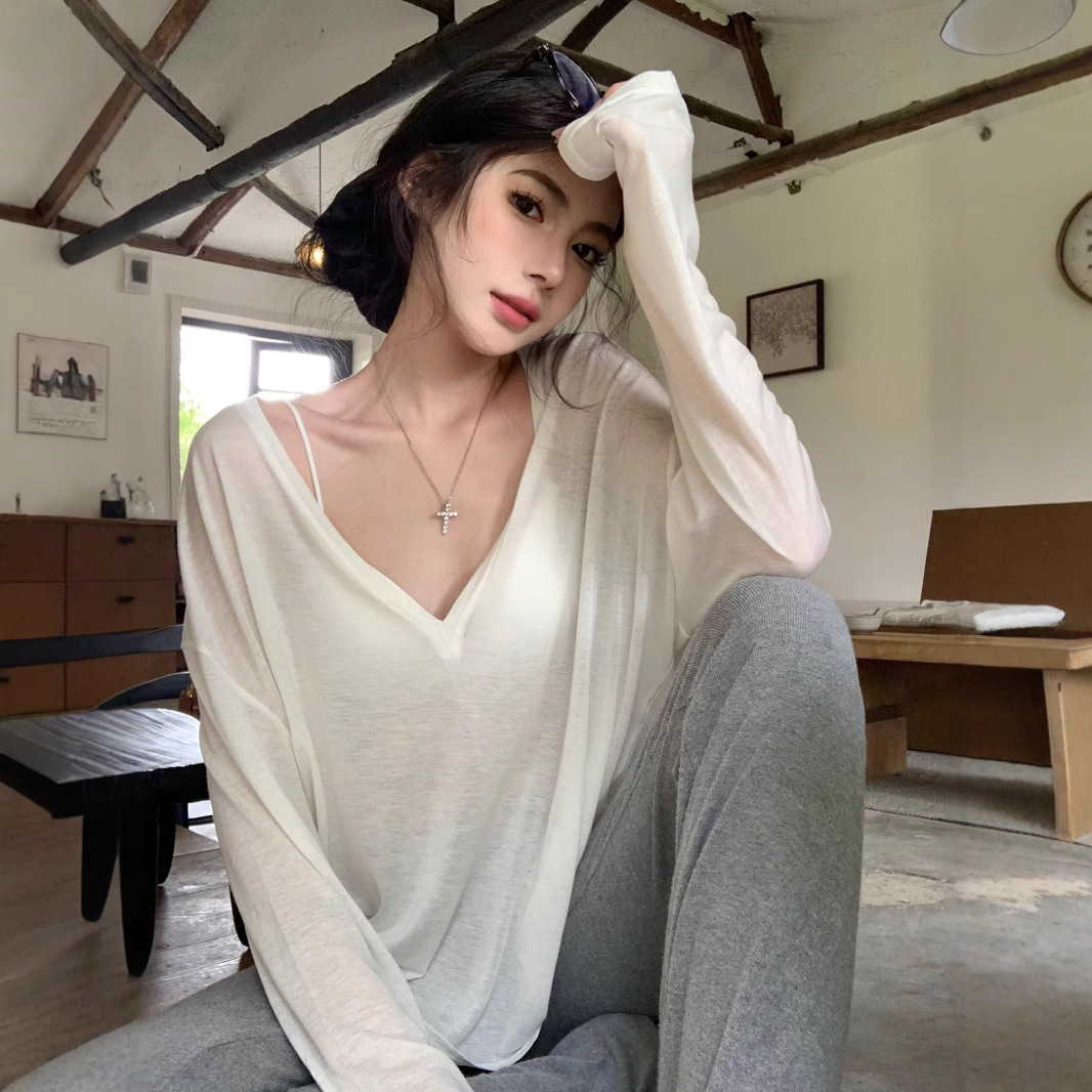 Pure Desire 薄い微透け V ネック長袖 Tシャツレディース夏ルーズ日焼け止めブラウス気質カジュアルボトリングシャツトップ