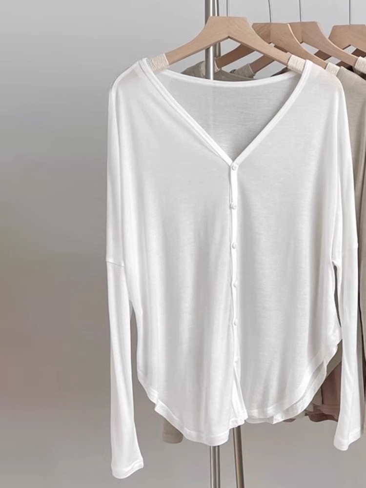 リラックス感のある白いvネックの日焼け止めtシャツの女性服の夏の純粋な欲望のギャルの薄いタイプのゆるいエアコンのブラウスの上着