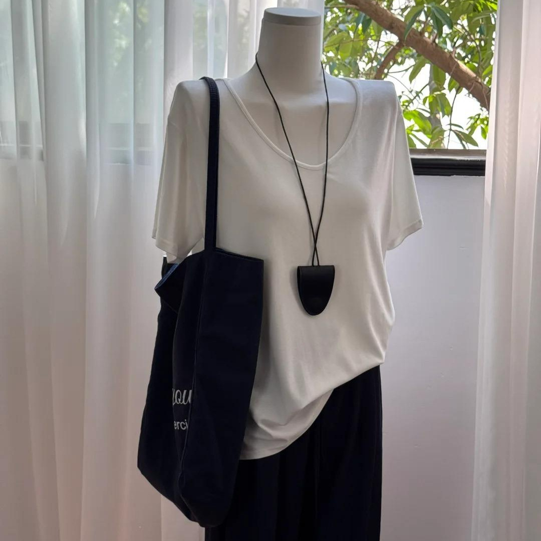 洋風デザイントップス2025秋カーブヘムミドル丈ゆったり着痩せ白長袖ボトムTシャツ